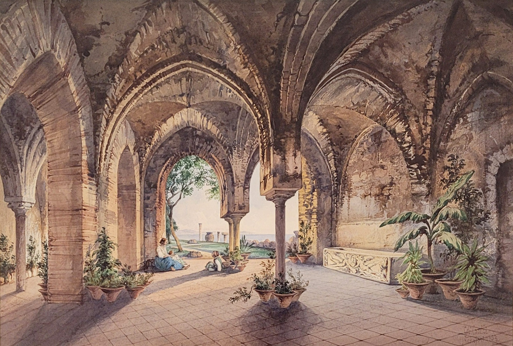 CARELLI, Gabrielle (1820-1900): Blick durch ein Gewölbe auf das MeerAquarell auf Papier, signiert und datiert 1893 sowie bezeichnet „Francfort“ unten rechts, 33 x 49 cm, gerahmt unter Glas und Passepartout