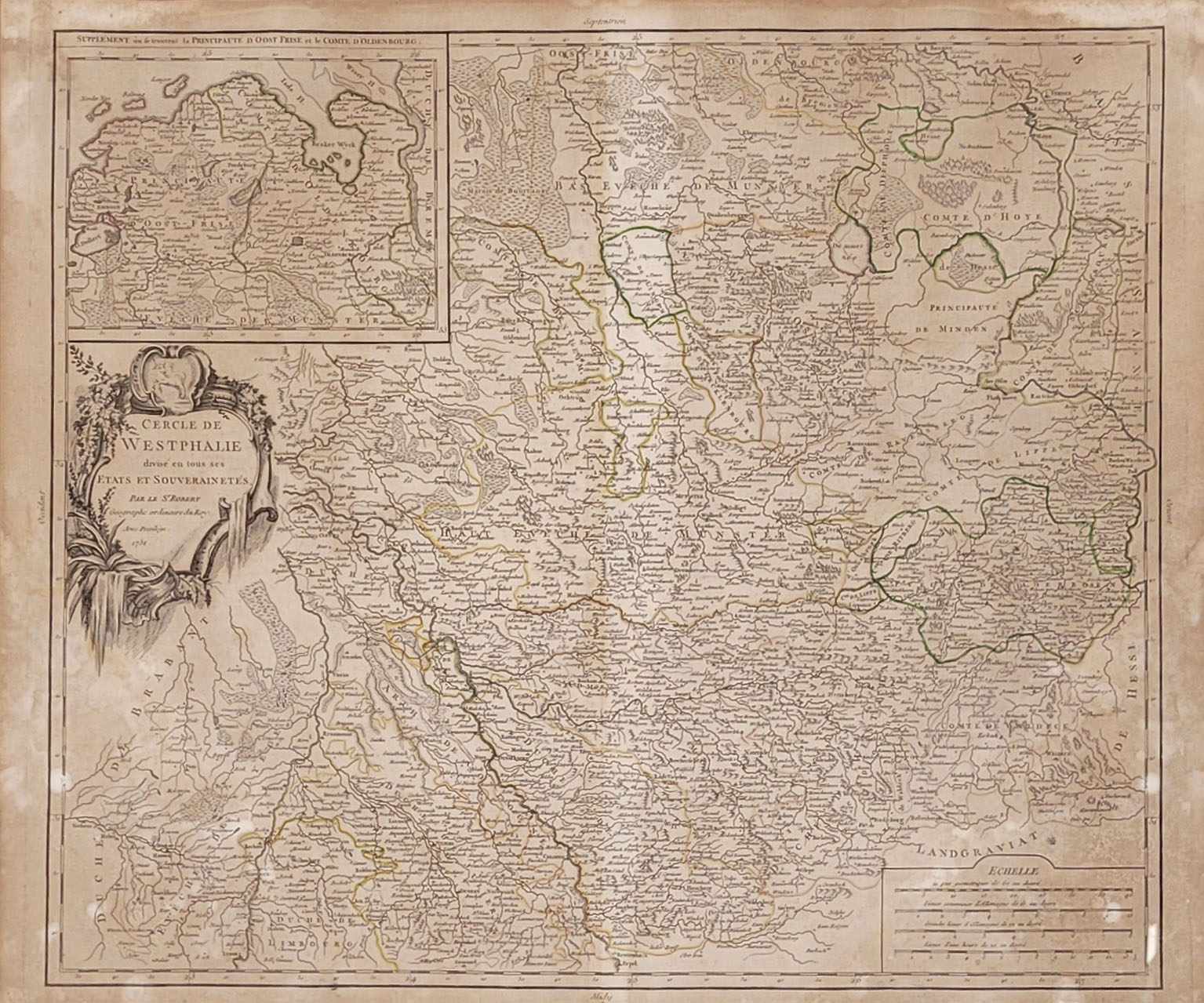 Kupferstich, koloriert, 59,5 x 49,5 cm, gerahmt unter Glas VAUGONDY, Robert de (1723-1786), Cercle Westphalie, Kupferstich, 1751, grenzkoloriert, 50 x 60 cm, gerahmt unter Glas und Passepartout (Papierschäden)
