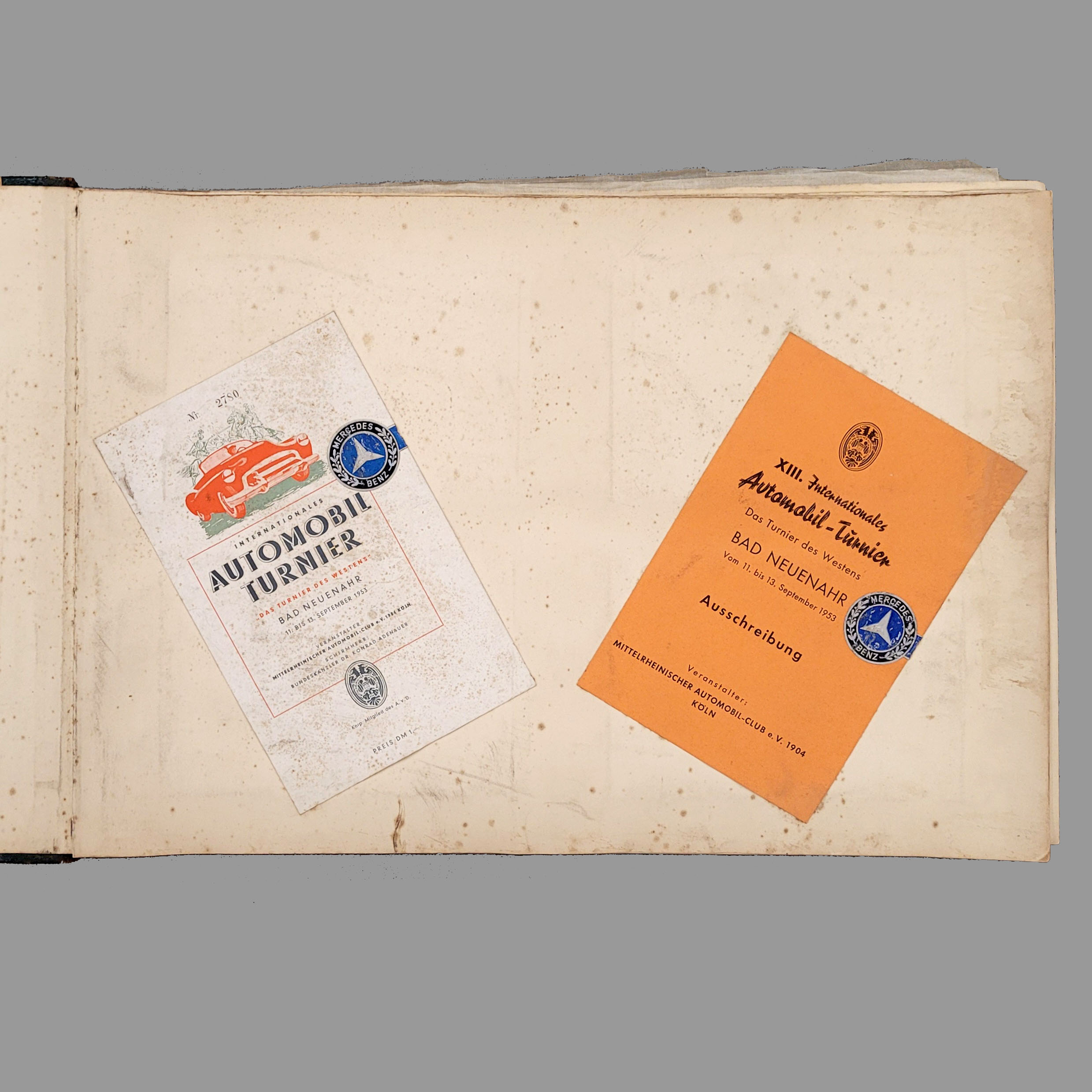 auf dem Vorsatz Eintrittskarte des „Internationalen Automobil-Turnier Bad Neuenahr 11.-13. September 1953“, 242 Photos auf 31 Seiten, Photos zum Teil von Bad Neuenahr, aber auch von Turnieren in München und Hamburg (Fahrer Hermann Boehm, Heinz Schellhaas, Franz Rüther, Wolfgang Sauermann, Benno Sommer u.a.), Photos 12 x 17 cm (Album verschmutzt)