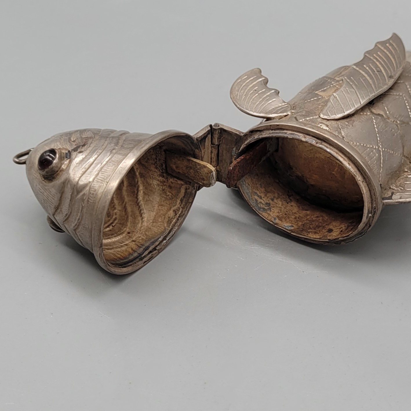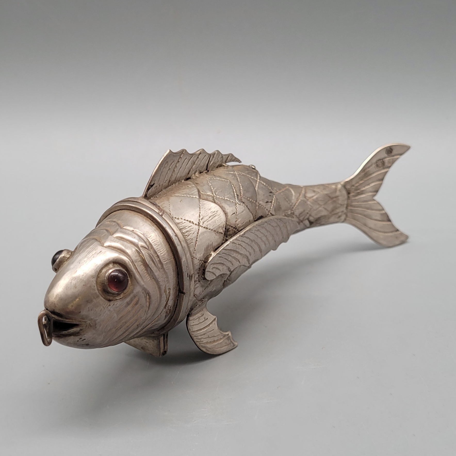 Besamin-FischbehälterSilber, Kopf abklappbar, Augen in Farbstein eingelegt, Länge 16 cm, Gewicht 120g