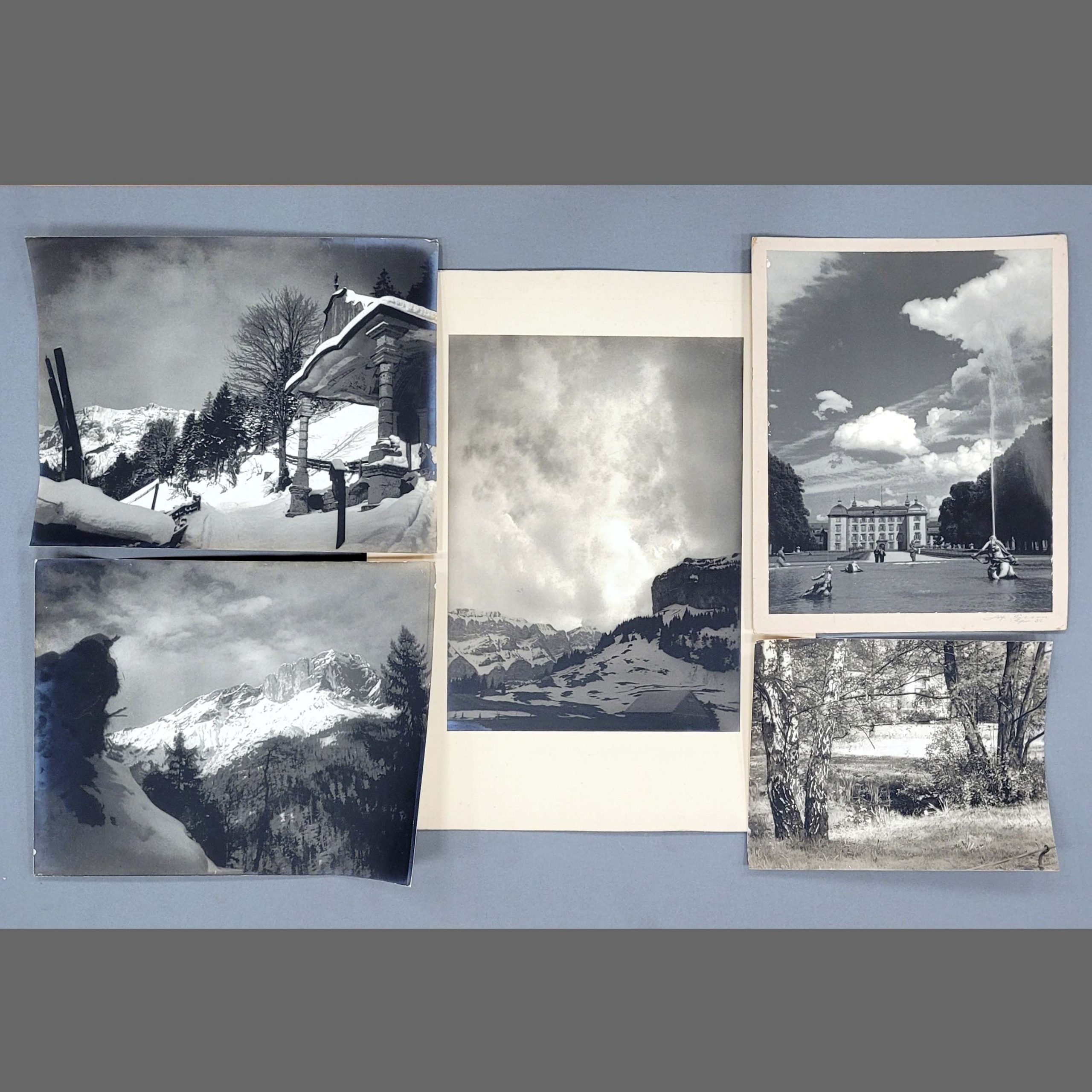 PERSON, Alfred (1885-1976): Schloss Schwetzingen / 3 Winterlandschaften /1 Sommerlandschaft5 Silbergelantineabzüge, um 1930-35, aufgezogen auf Karton (2x), signiert unten rechts bzw. verso (2x), bis zu 56 x 44 cm (ohne Karton)