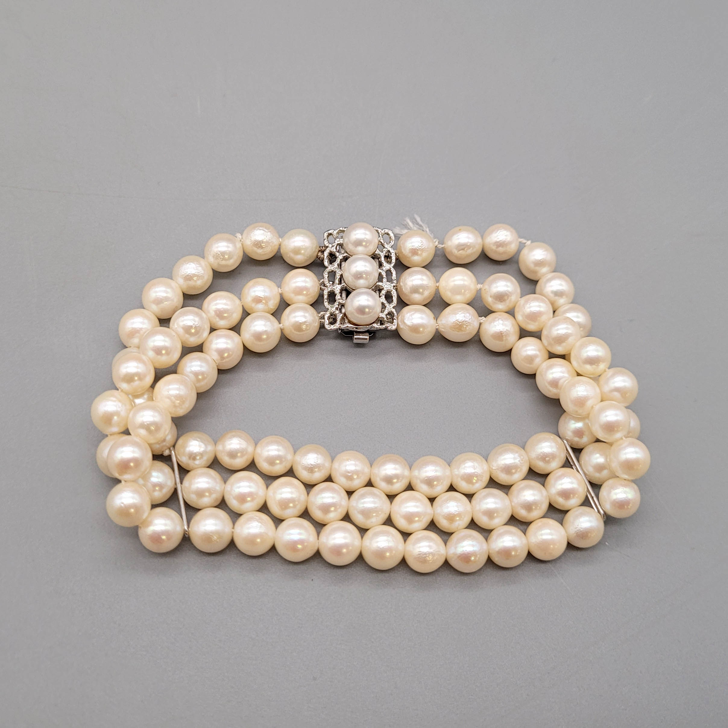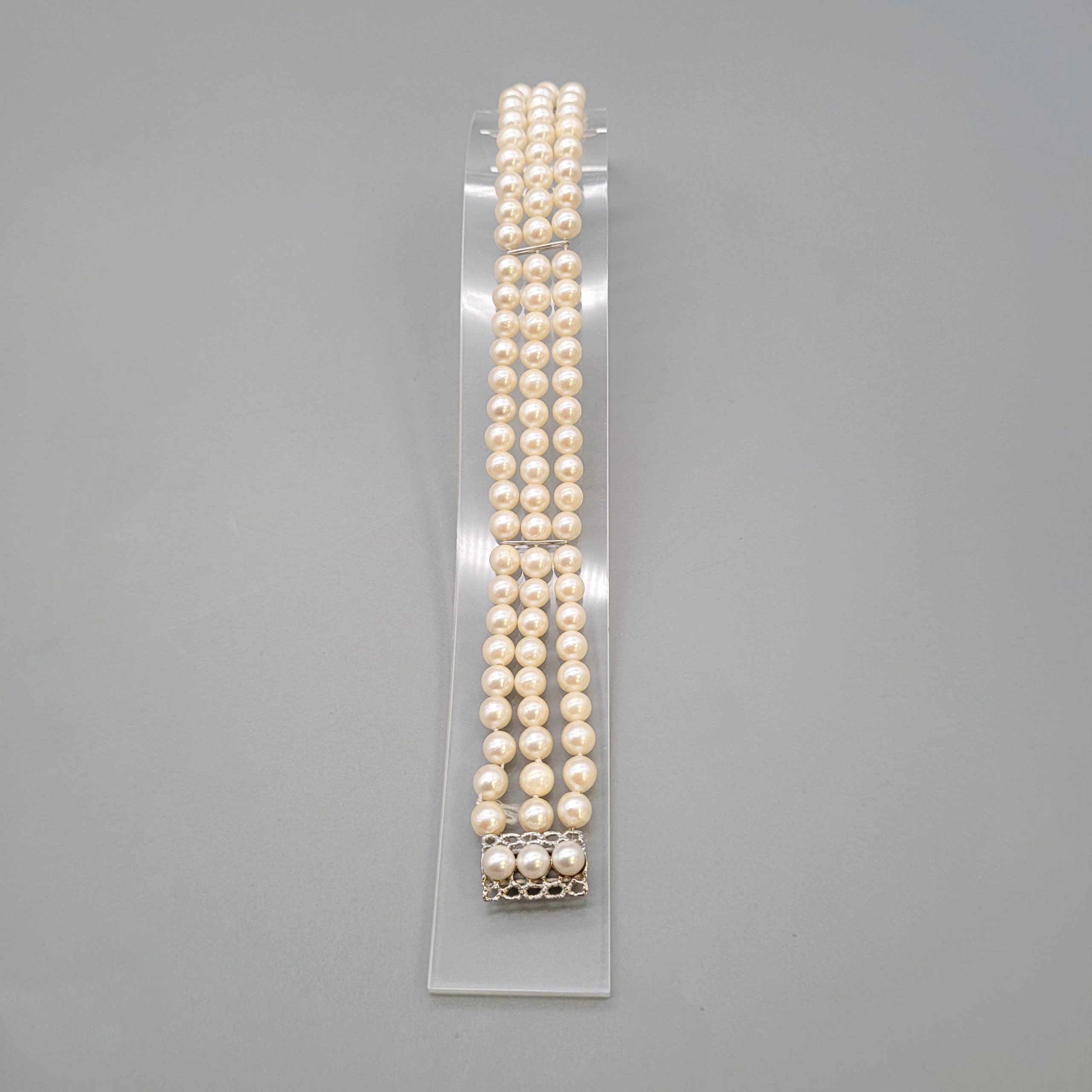 ArmbandPerlen, dreireihig, 2 Querglieder, Verschluss 333er Weißgold mit 3 Perlen, Länge 20 cm