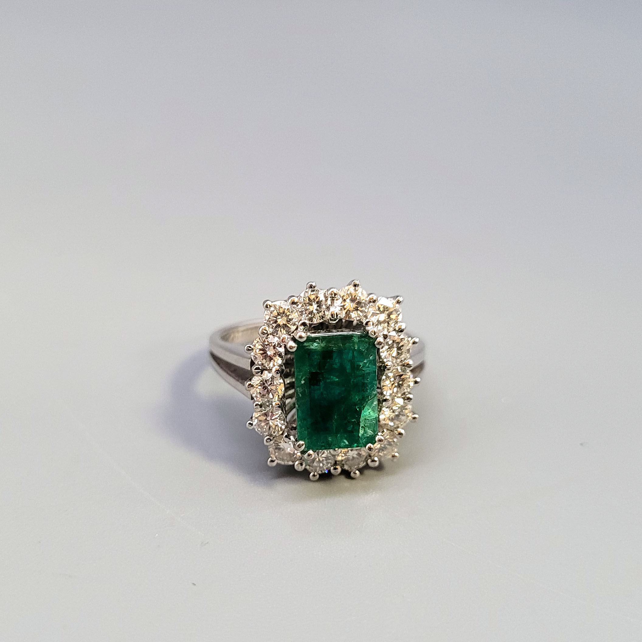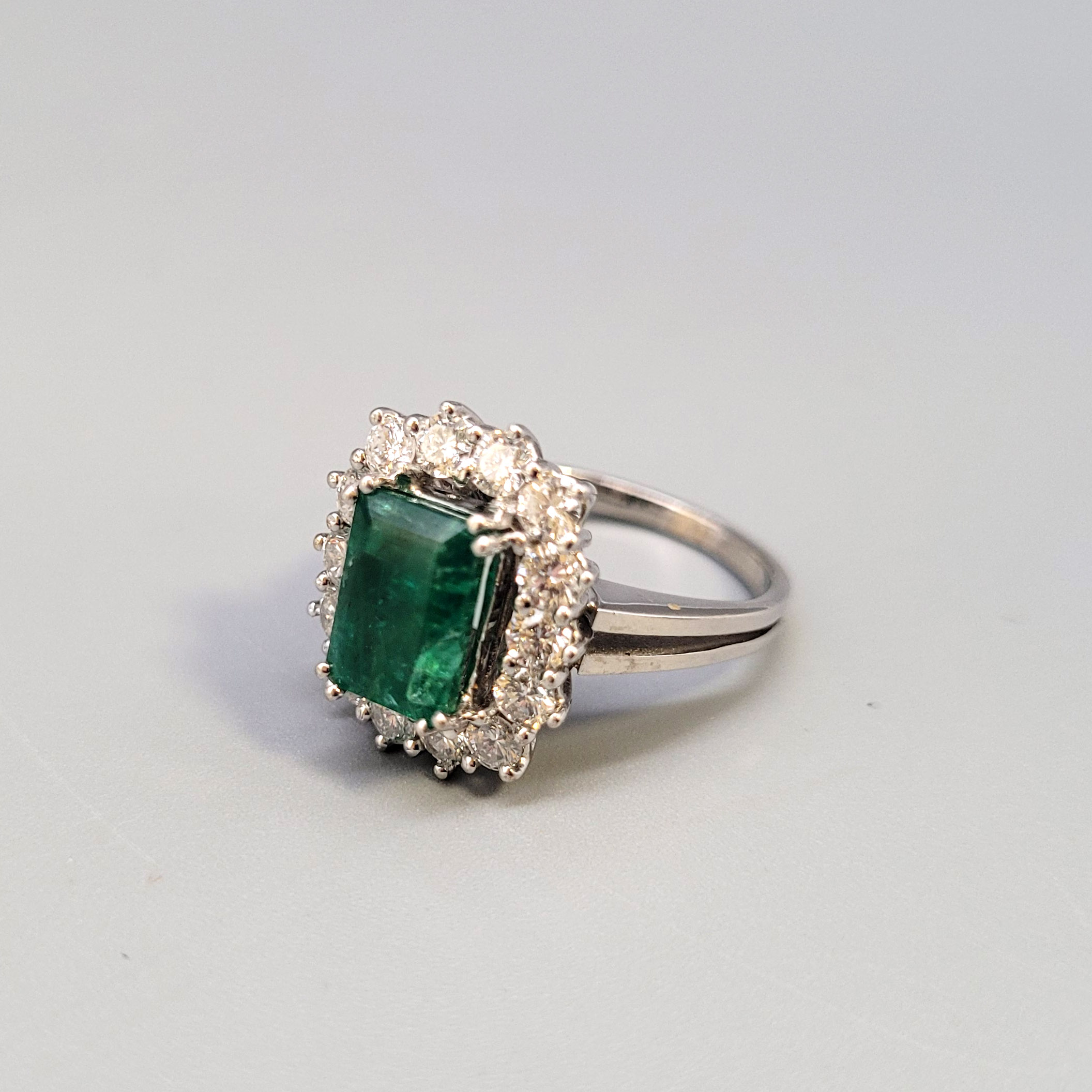 Damenring750er Weißgold, Smaragd (leicht beschädigt), 14 kleine Brillanten (zusammen ca. 0,60 ct), Ringgröße ca. 53, Gewicht 6g