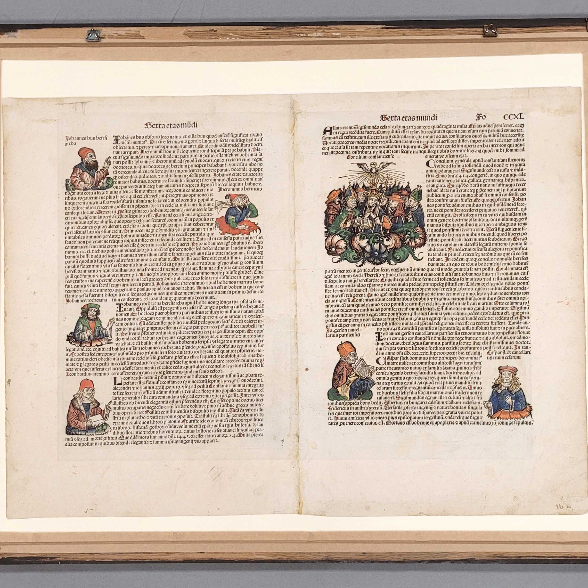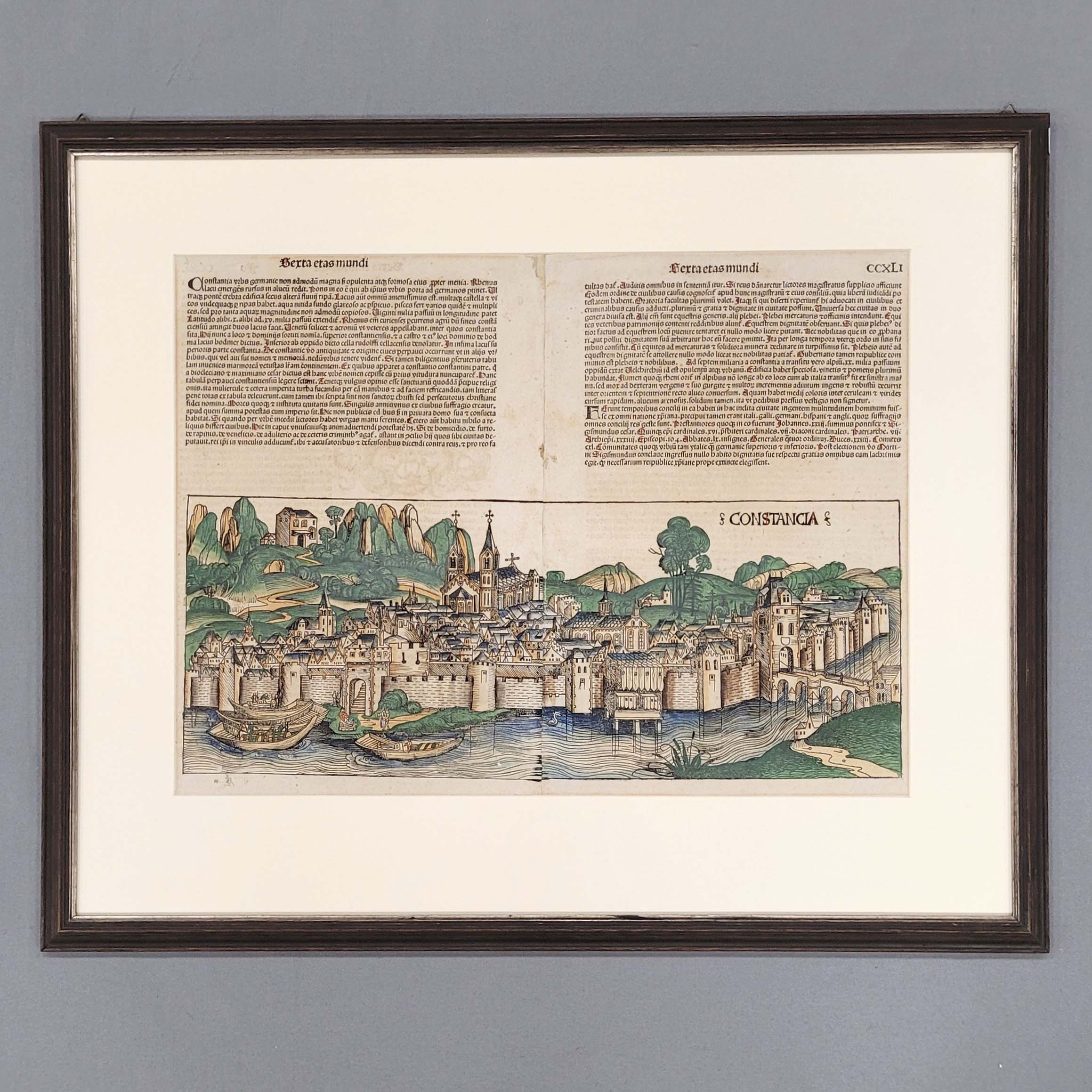 Constancia – KonstanzHolzschnitt auf Doppelfoliobogen, altkoloriert, aus: Schedelsche Weltchronik, Blatt CCXLI, Lateinische Ausgabe, Nürnberg (Koberger) 1493, 38,5 x 52,5 cm, beidseitig verglast gerahmt mit Passepartout
