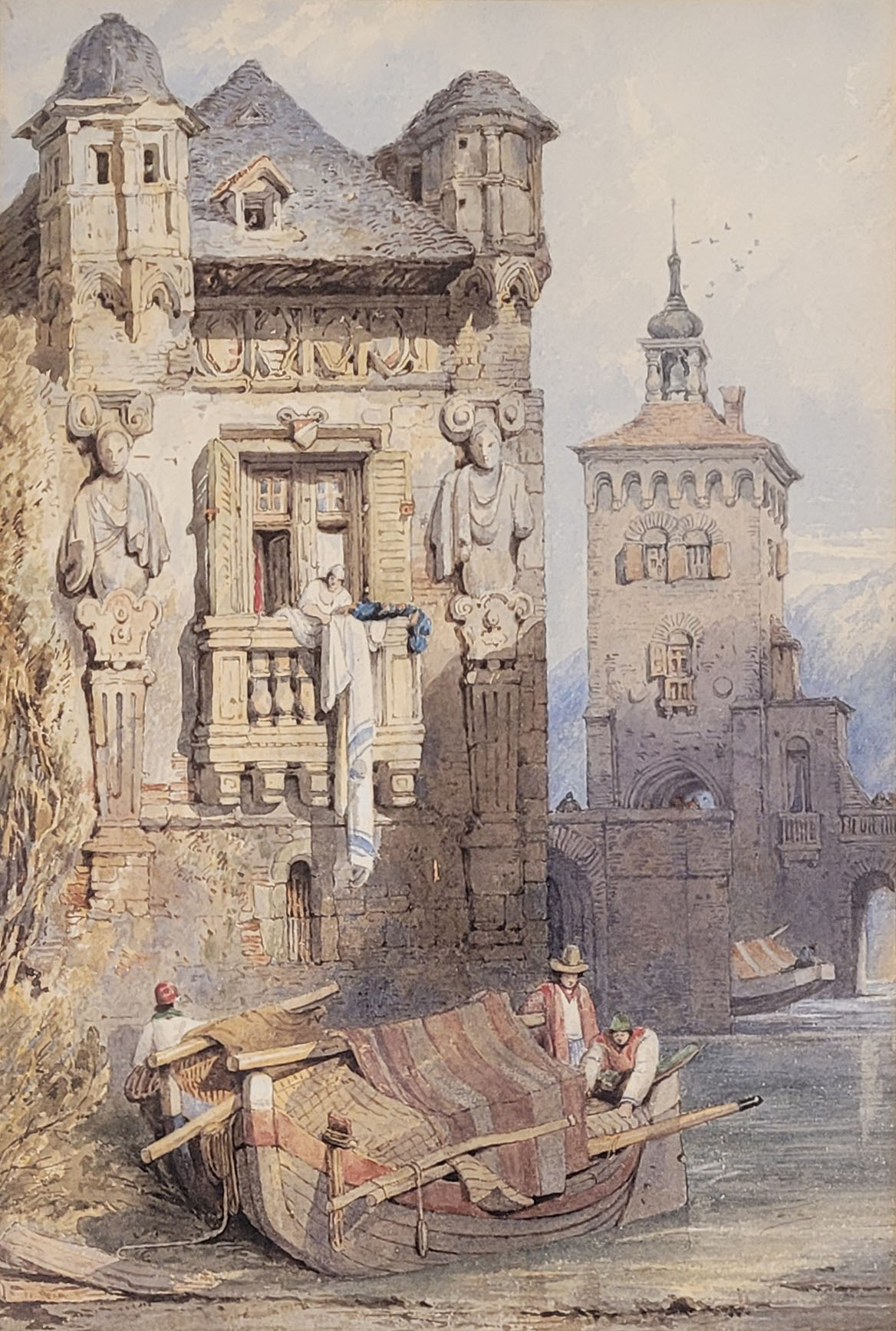 PROUT, Samuel (1783-1852): An der Moselzugeschrieben, Aquarell auf Papier, aufgezogen auf Karton, auf Holzplatte gelegt, 42 x 28 cm, gerahmt unter Glas