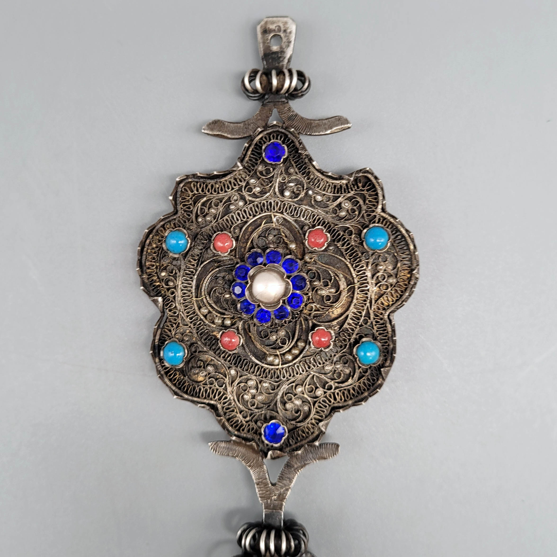 Miederanhänger, sogenannter „Schnürstift“13-lötiges Silber, teilweise filigran gearbeitet, Glasperlen und Steinbesatz, Bayern 19. Jahrhundert, Höhe 16 cm