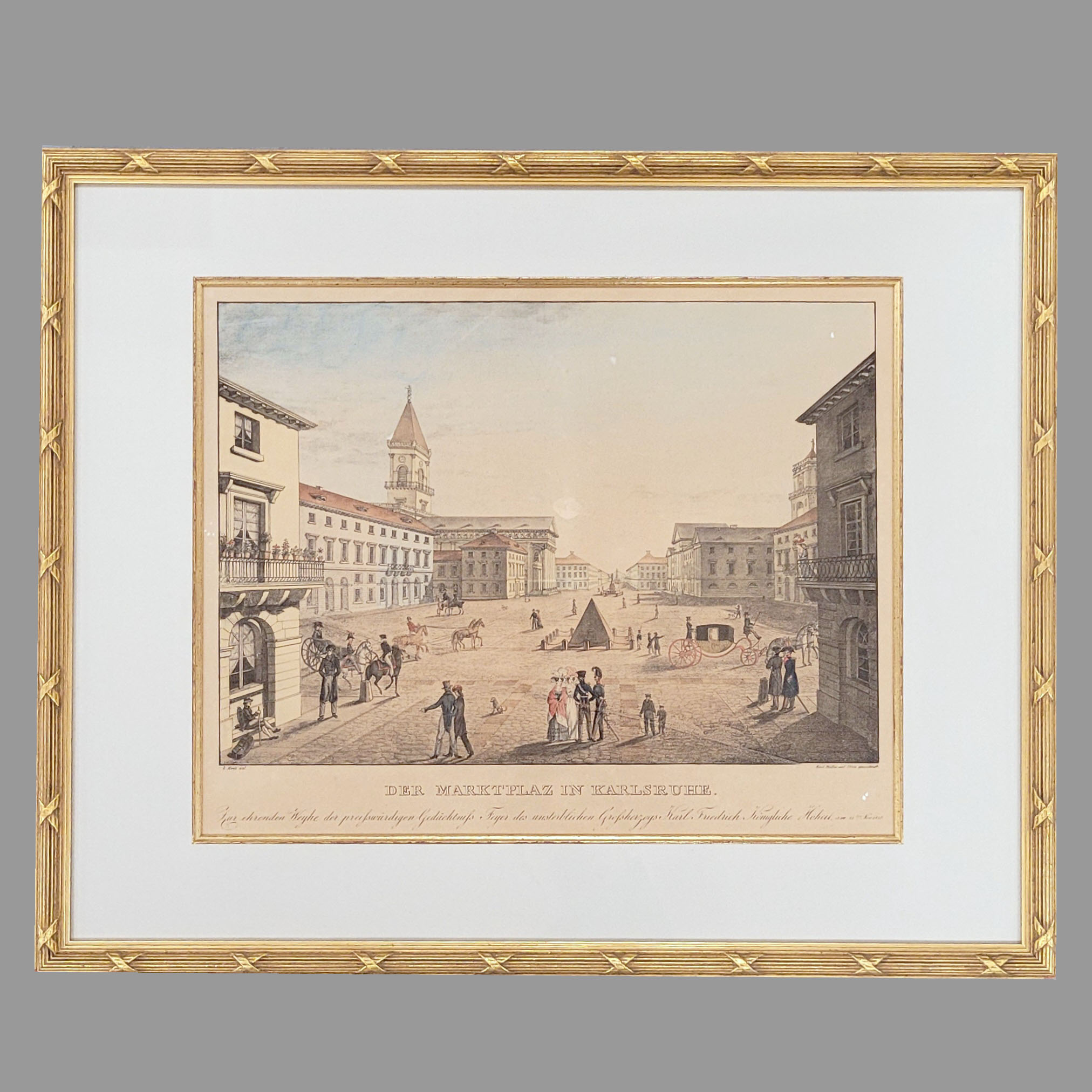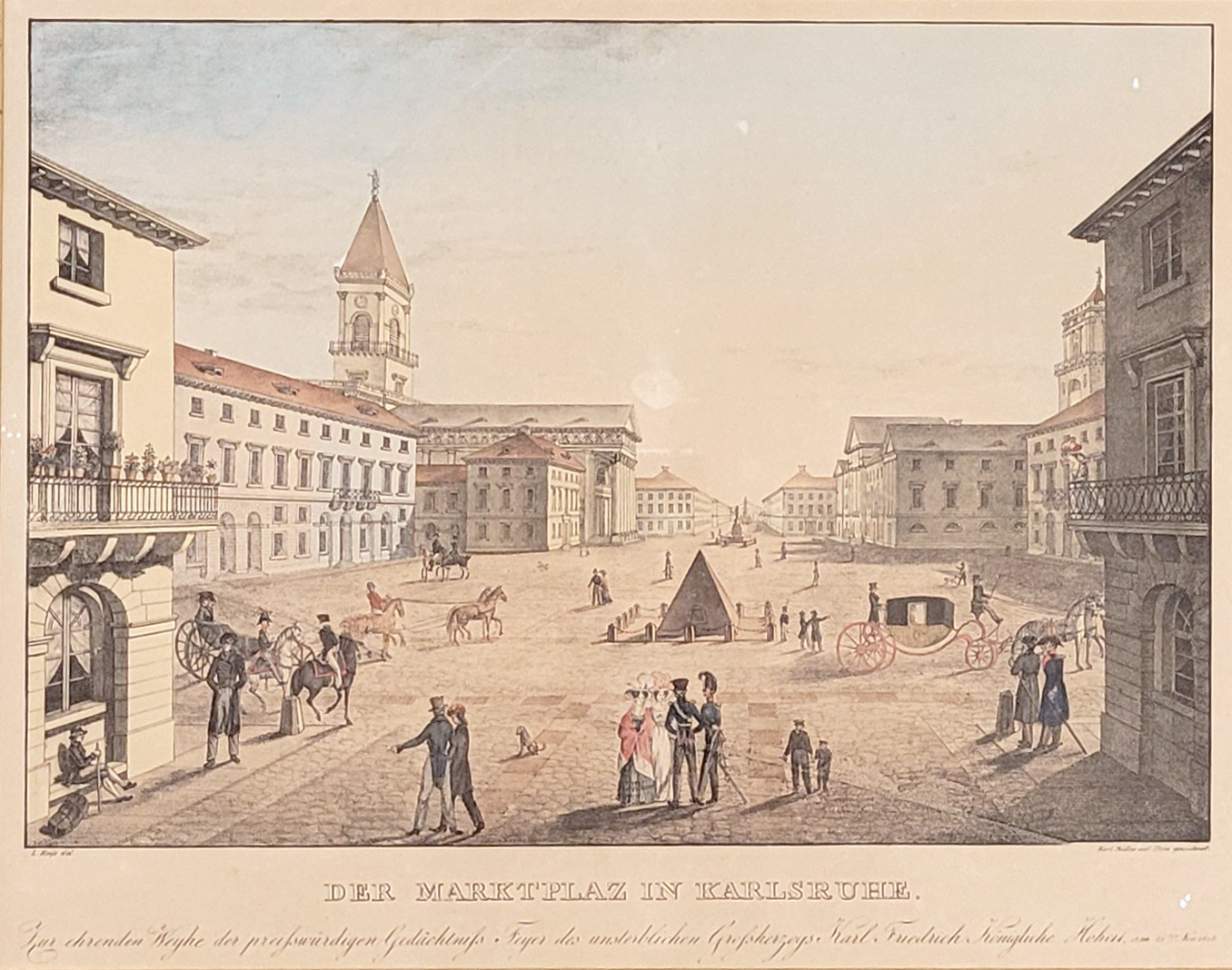 MÜLLER, Karl (tätig Anfang 19. Jh.): Der Marktplaz in KarlsruheLithographie, 1828, altkoloriert, 35 x 43 cm, gerahmt unter Glas und Passepartout (gleichmäßig gebräunt)
