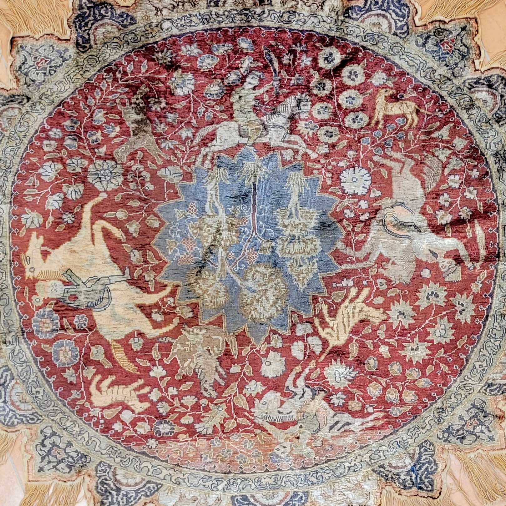 Kayseri mit Jagdszene, Seide, um 1930, Durchmesser 133 cm, Zustand B/C