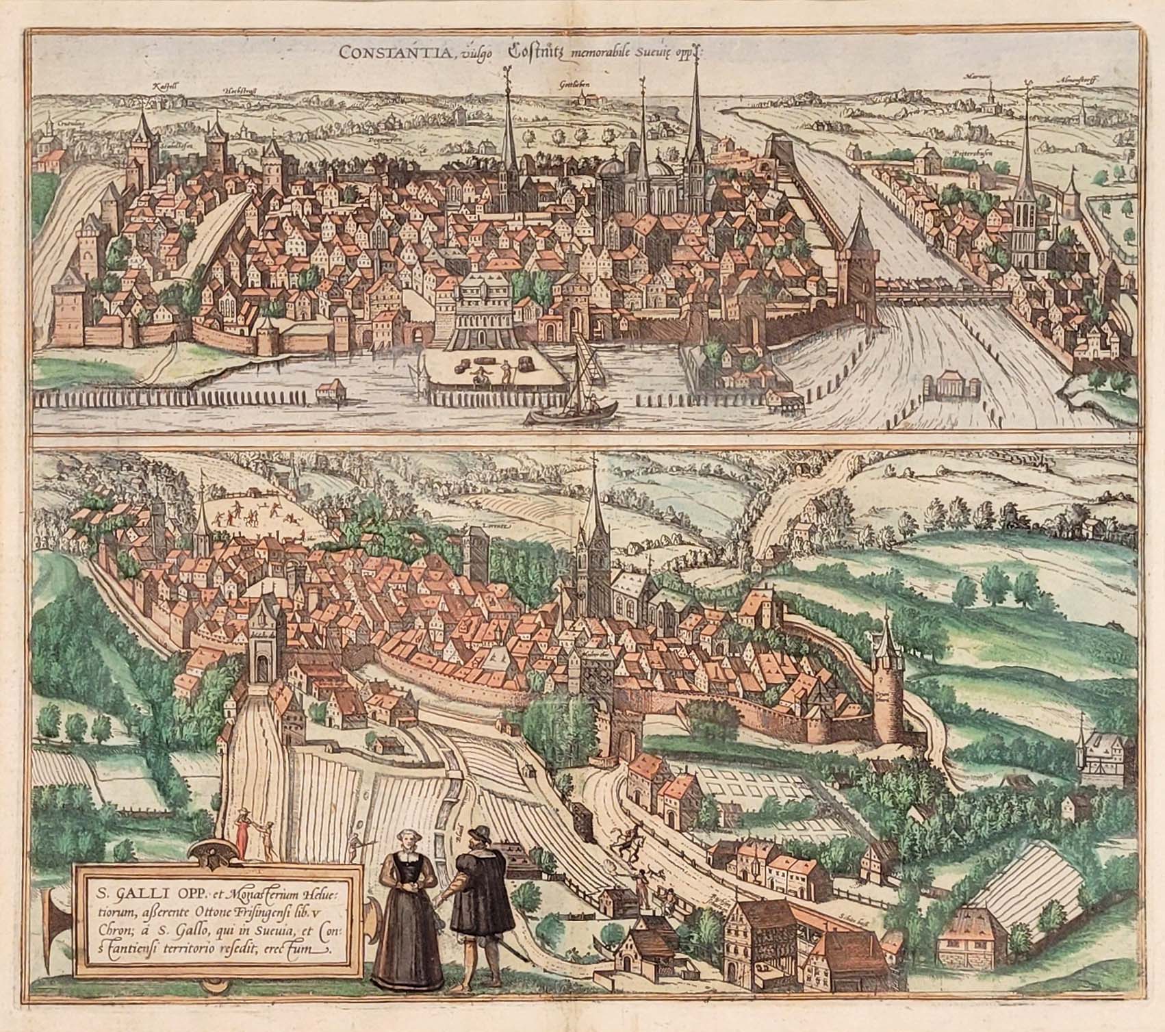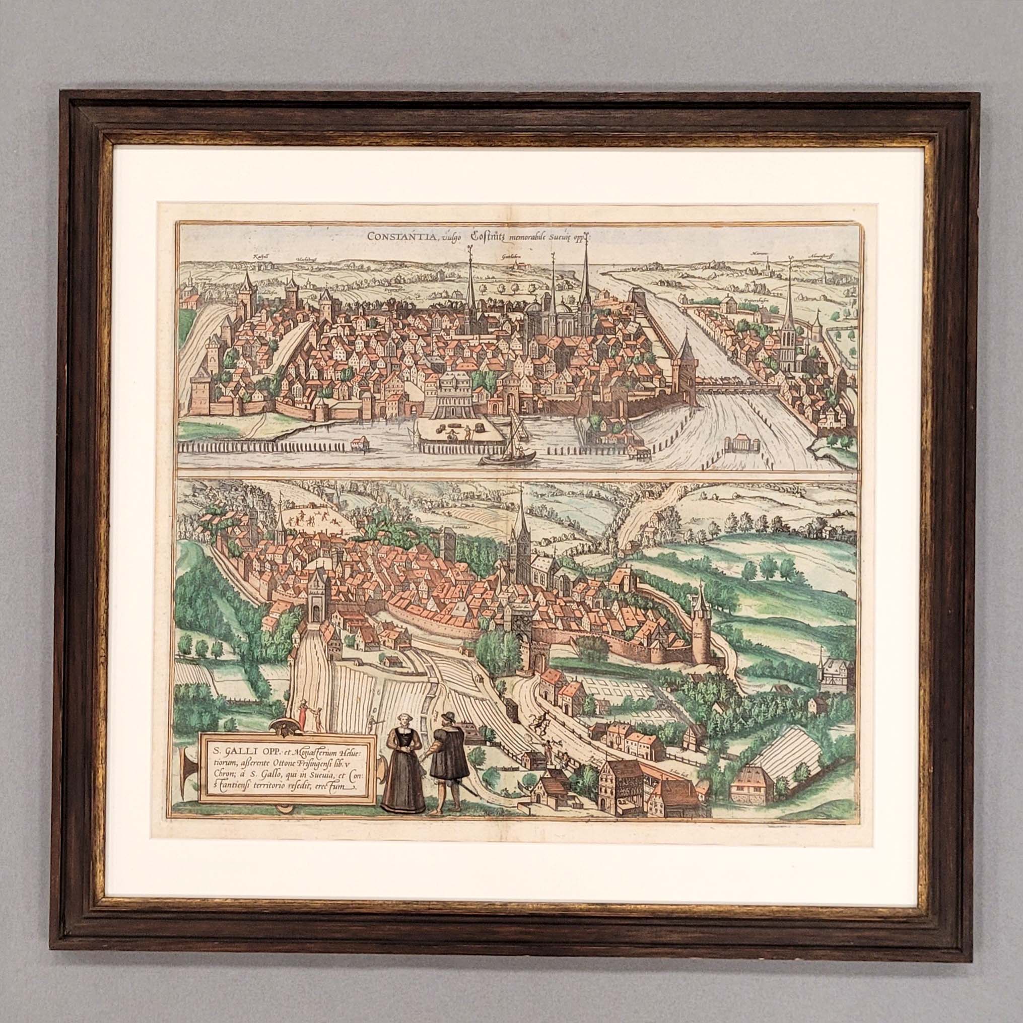 Konstanz und St. GallenHolzschnitt, altkoloriert, aus Braun / Hogenberg, Civitatis Orbis Terrarum, 1575, 37,5 x 43 cm, gerahmt unter Glas und Passepartout