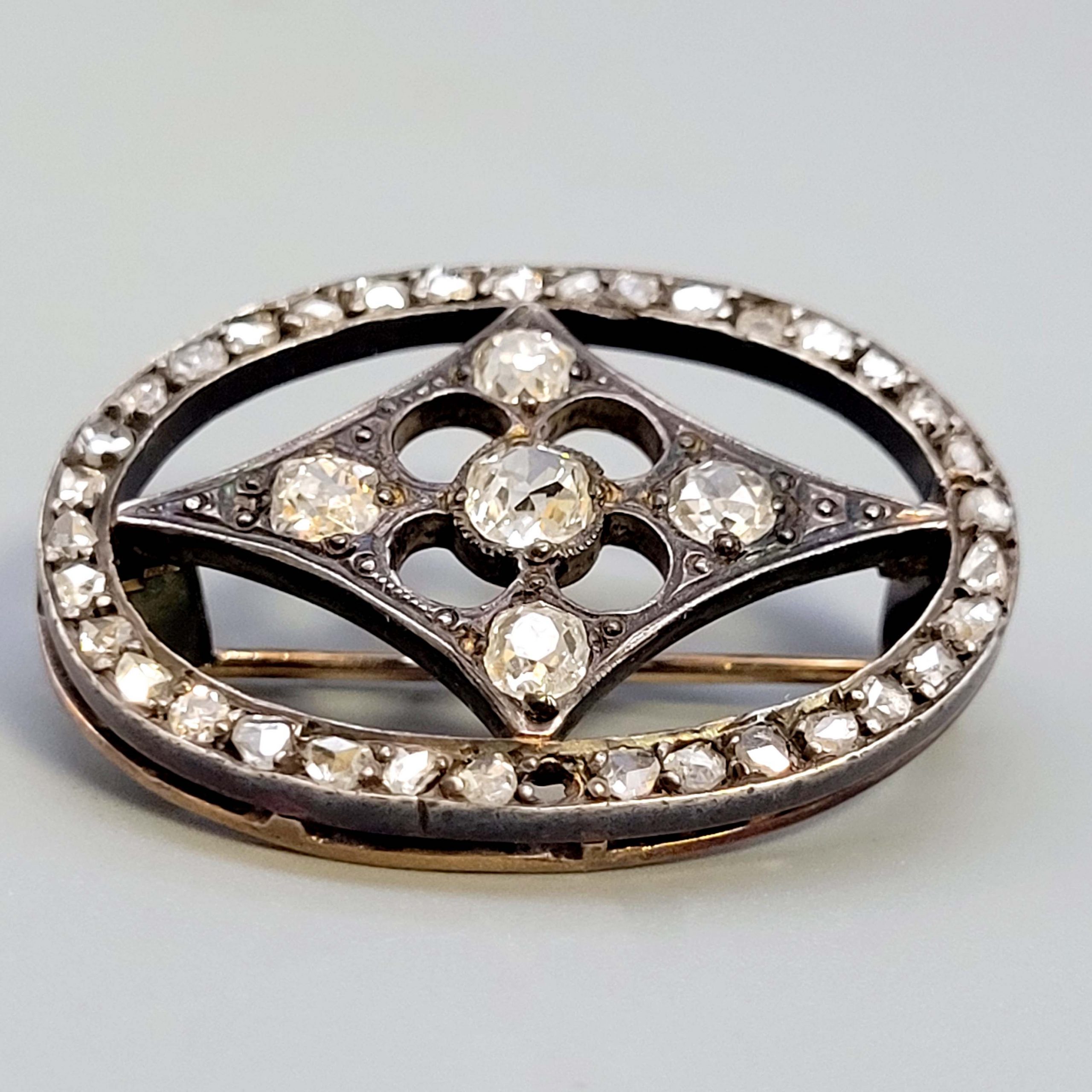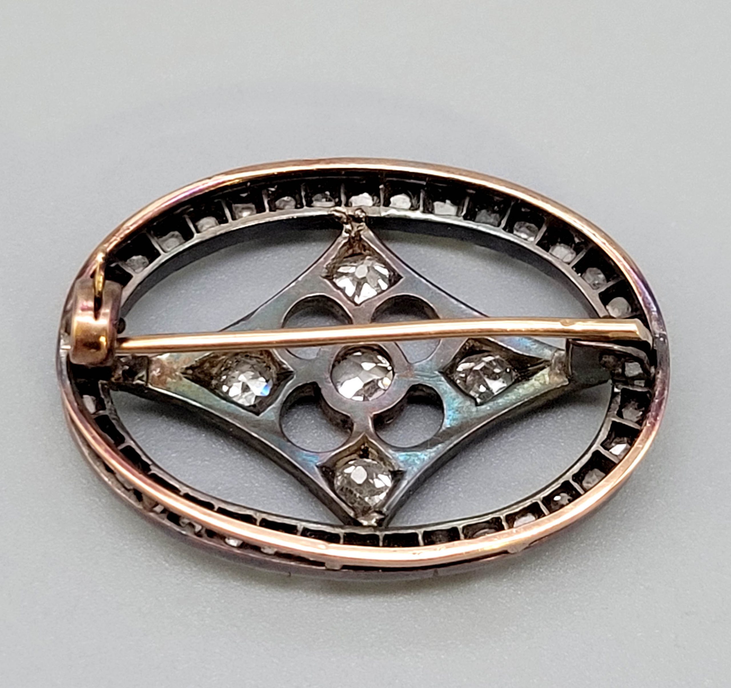 Brosche585er Rotgold, Silber, 4 Altschliffdiamanten (0,40 ct), Kranz von Diamantrosen (eine fehlt), um 1920, 3 x 2 cm, Gewicht ca. 5g