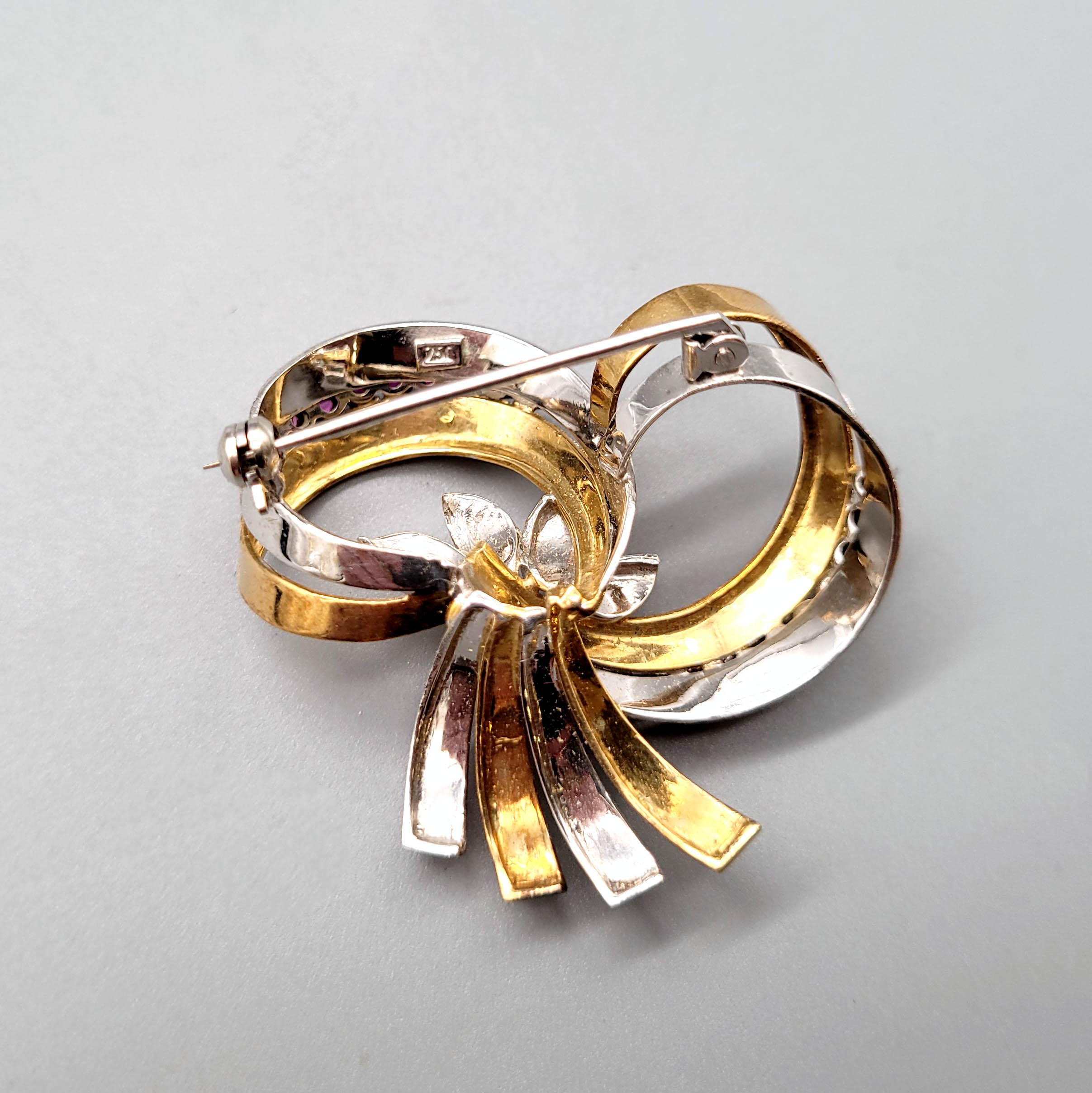 Brosche in Schleifenform750er Gelb- und Weißgold, partiell guillochiert, Rubinbesatz, 4 x 4 cm, Gewicht 14g