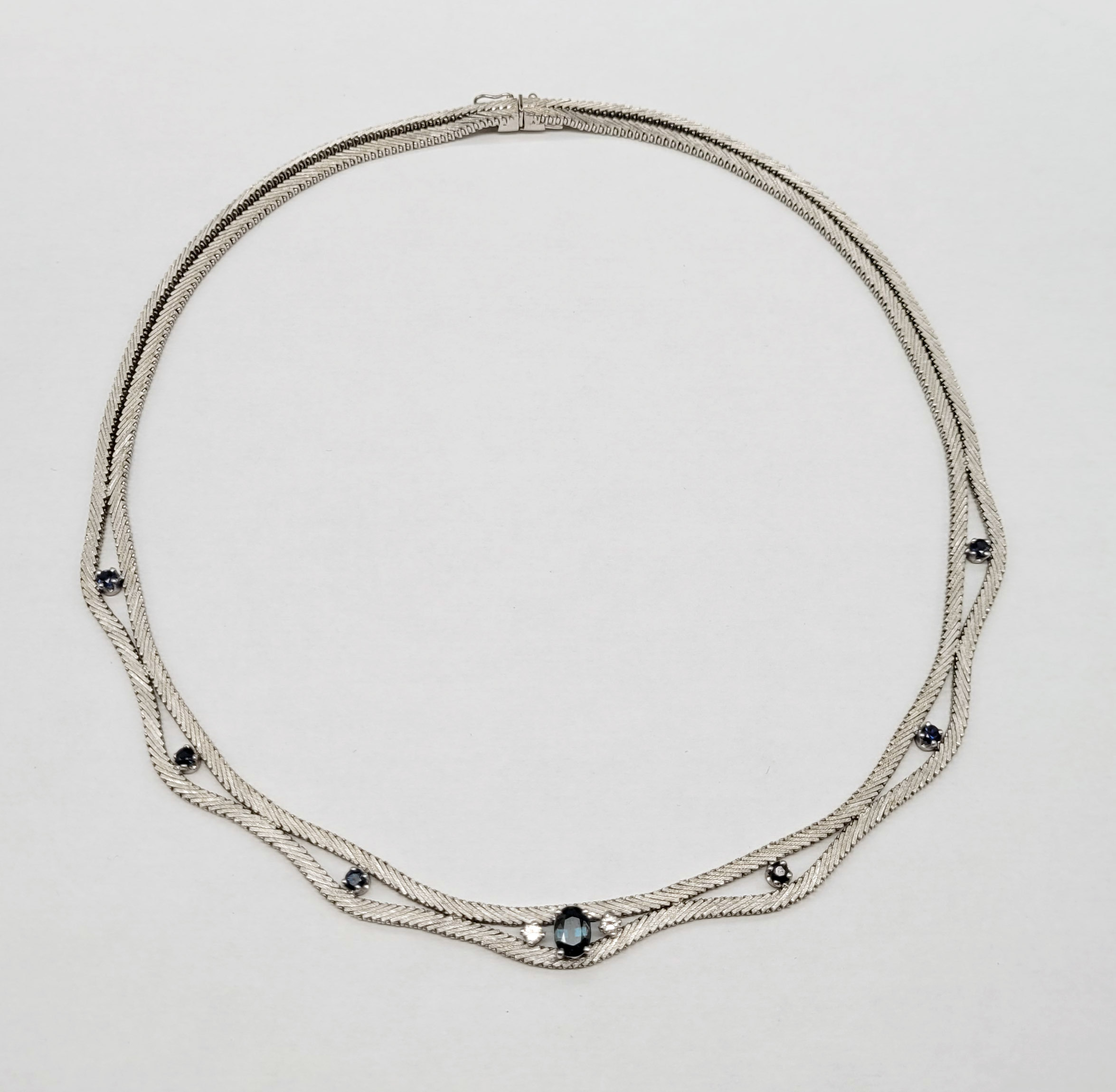 Zweireihige Halskette750er Weißgold, guillochiert, zentraler Saphir, flankiert von 2 kleinen Brillanten und 6 kleinen Saphiren, Kastenschloss mit Sicherheitsbügel, Länge ca. 43 cm, Gewicht ca. 49g
