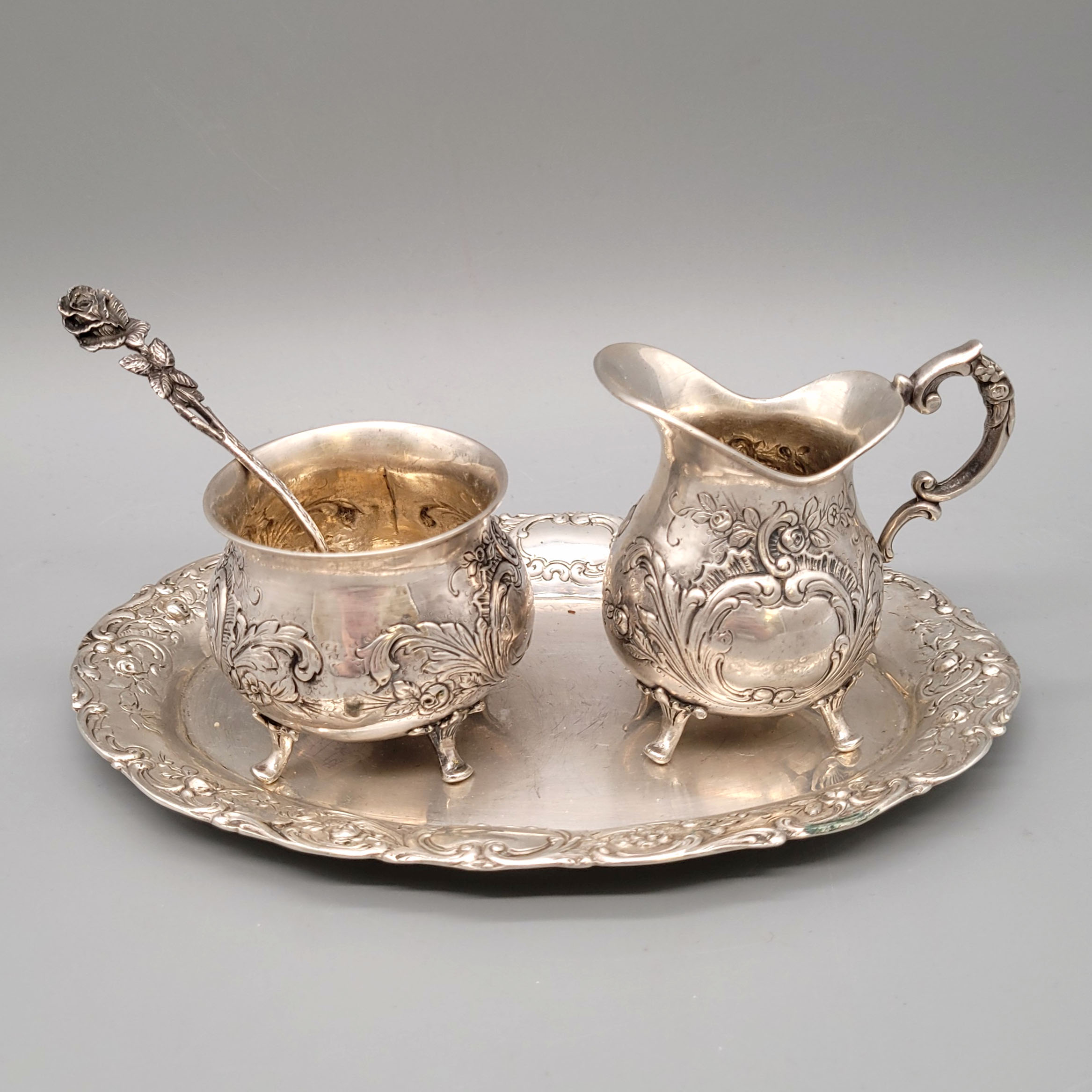 Milch und Zucker auf Tablett800er Silber, Christoph Widmann, Pforzheim, beigelegte Zuckerzange 925er Silber, Tablett 19 x 13 cm, Gewicht 320g