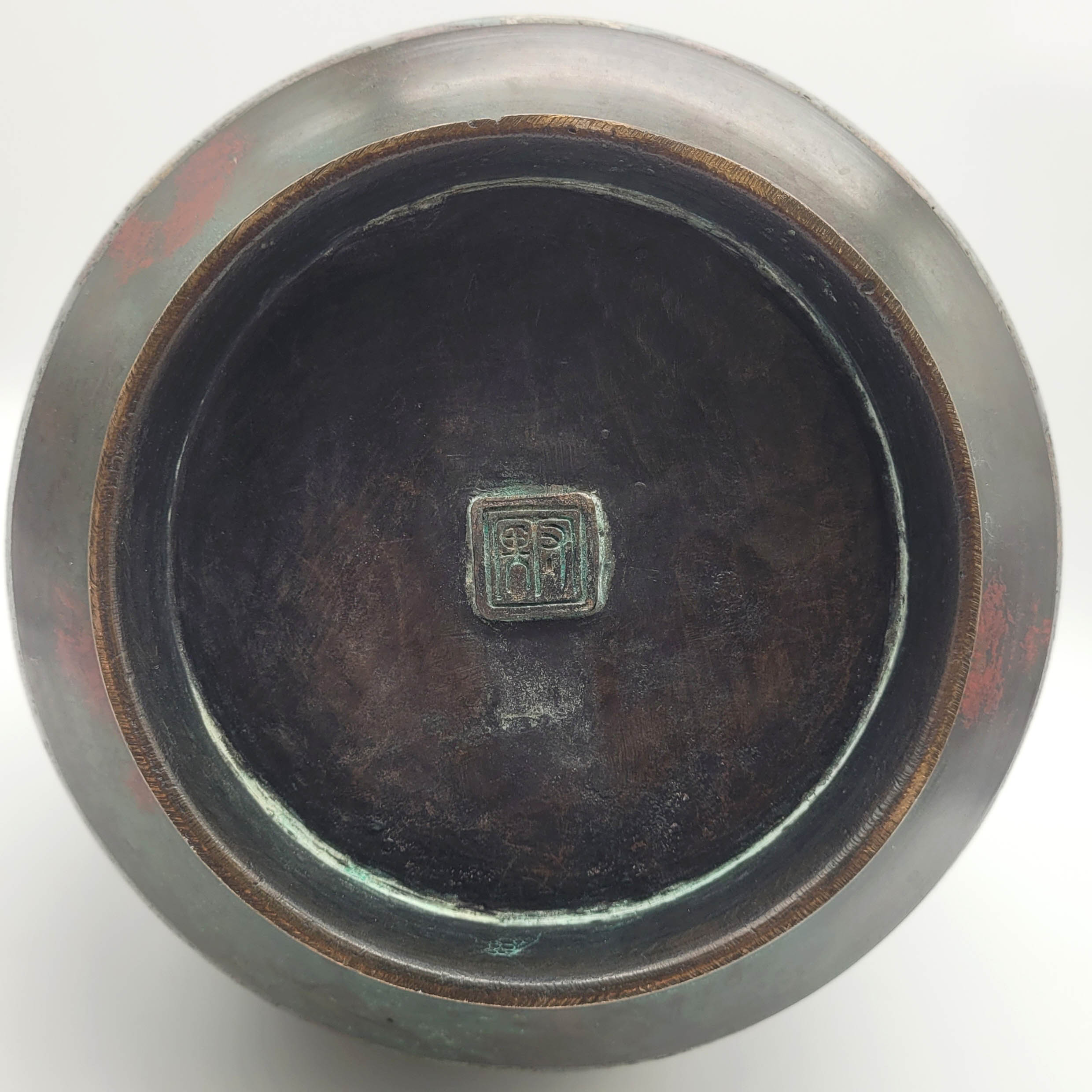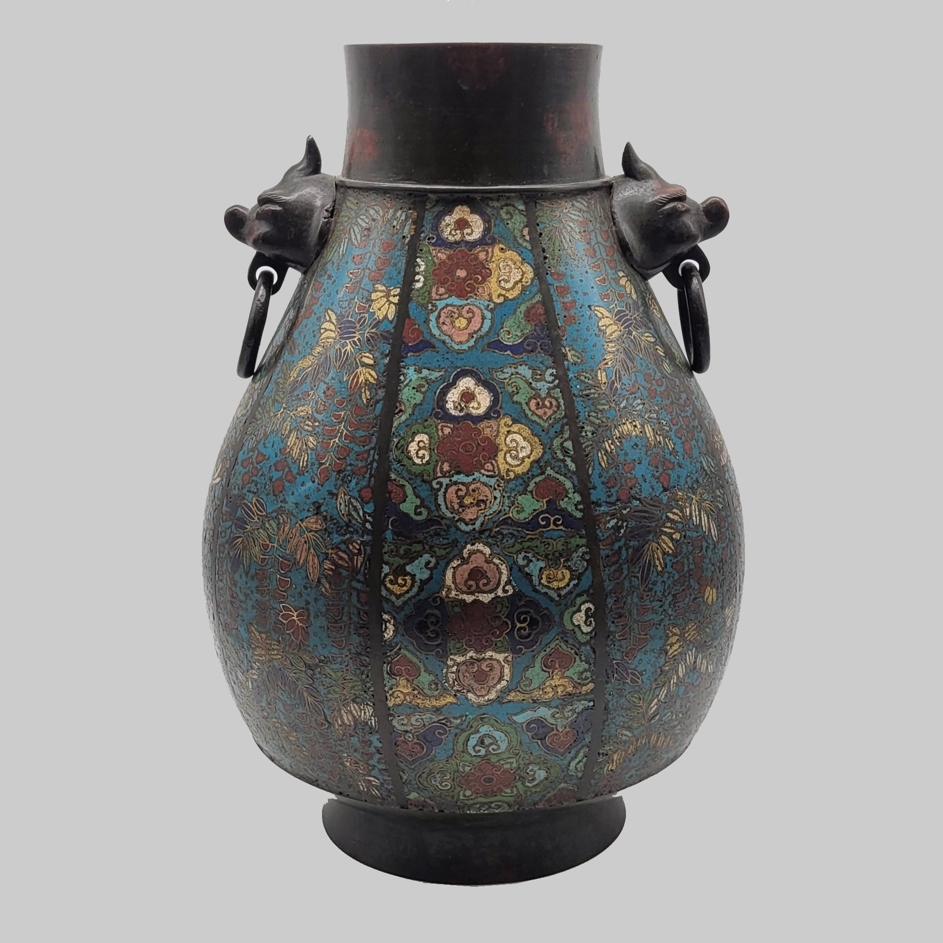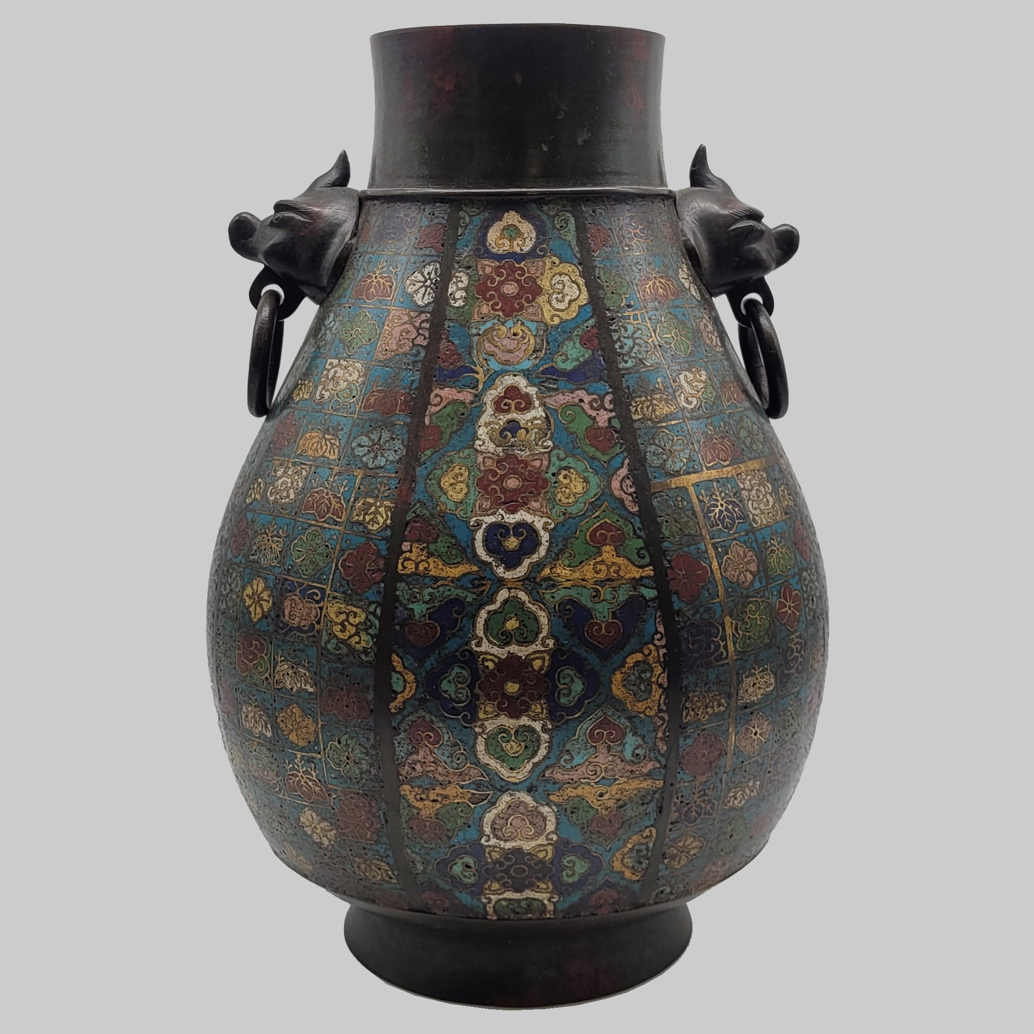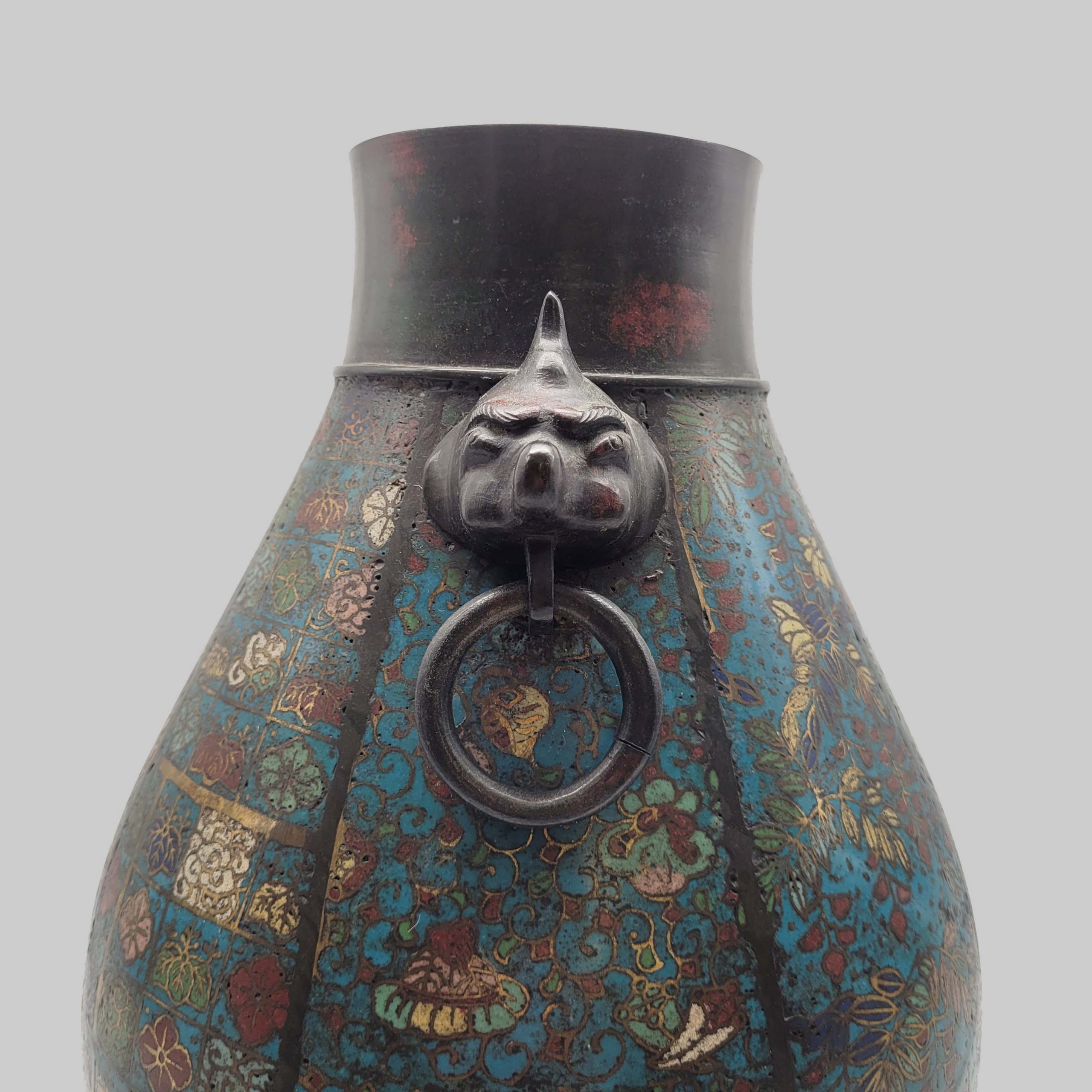 Große HenkelvaseBronze, mehrstreifiger Dekor in Cloisonné-Technik, Henkel in Form von Fabelwesen mit Ringen, bodenseitig gemarkt, China 19. Jahrhundert, Höhe 36,5 cm