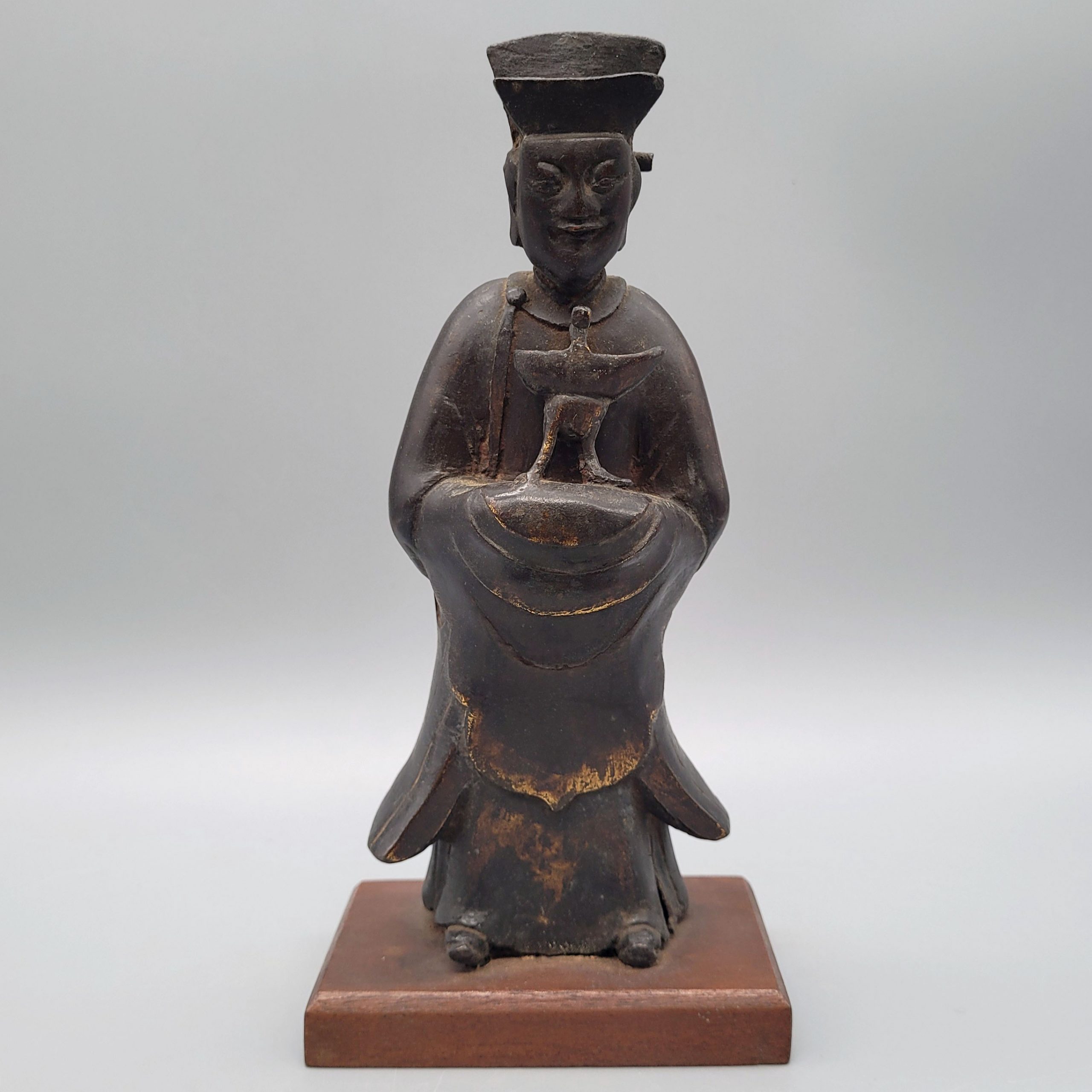 Diener mit WeingefäßBronze, Hohlguss, China 17. Jahrhundert, Höhe 18 cm (ohne Holzsockel)