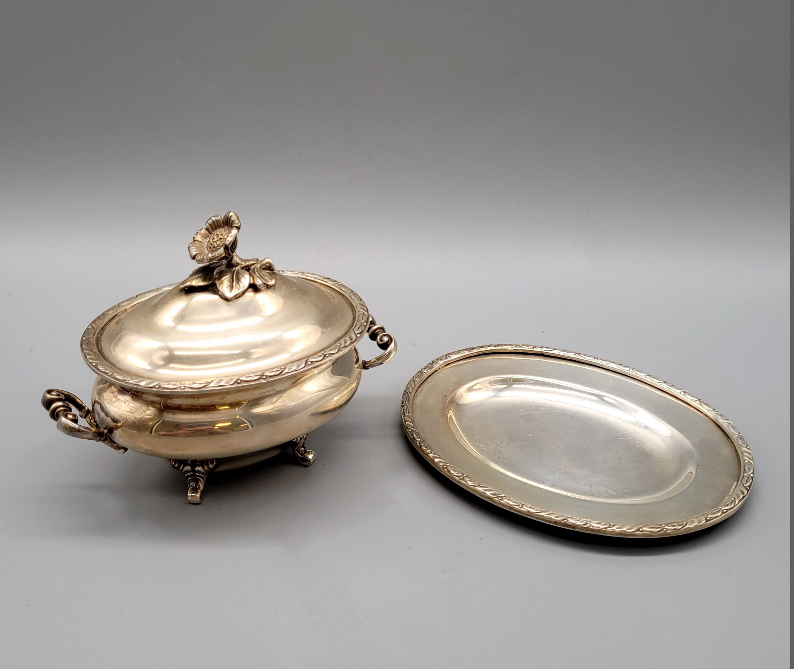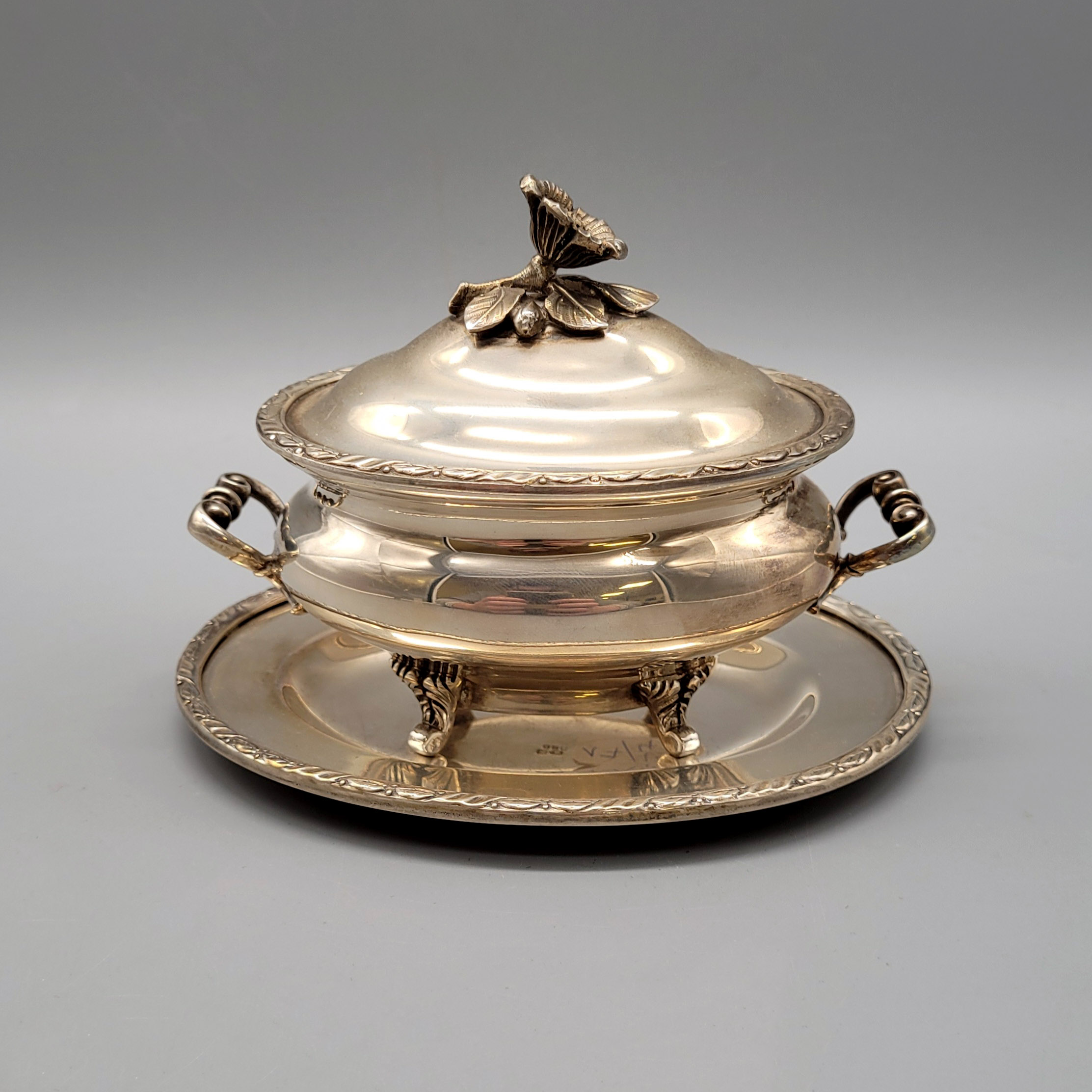 Deckeldose mit vier Füßen auf Tablett925er Silber, Deckelknauf in Form eines Blütenzweiges, Portugal 20. Jahrhundert, Deckeldose 9 x 12 x 7,5 cm, Tablett 13,5 x 10,5 cm, Gewicht 381g