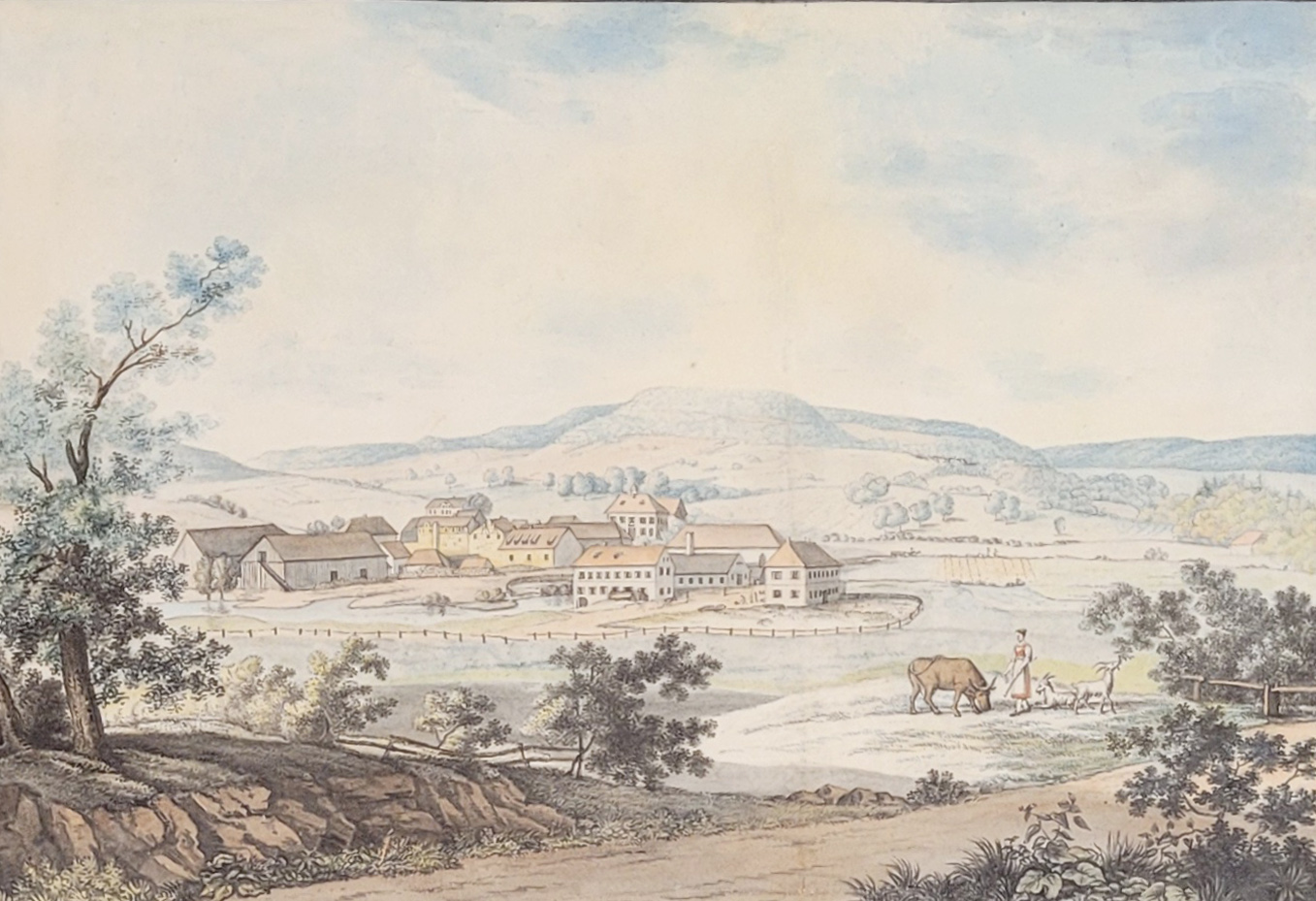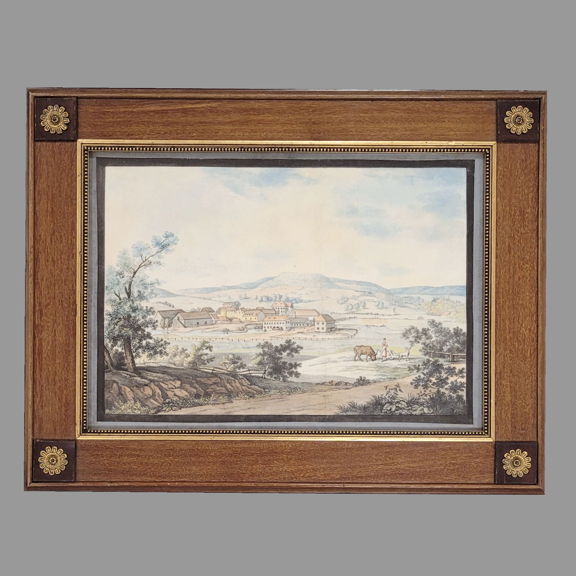 DEUTSCHER MEISTER (um 1820): Sächsischer(?) GutshofFeder, Aquarell auf Papier, 26,5 x 38 cm, gerahmt unter Glas