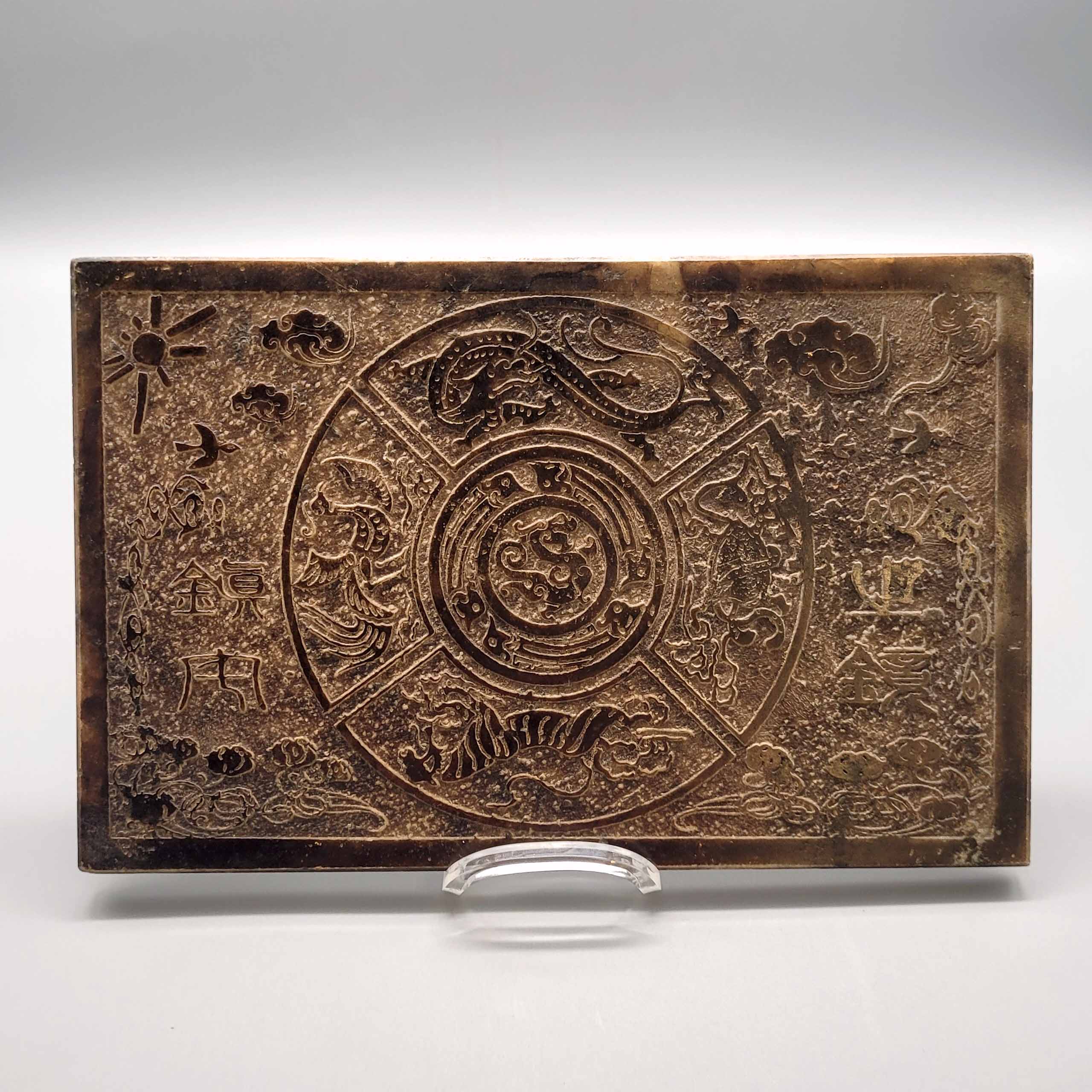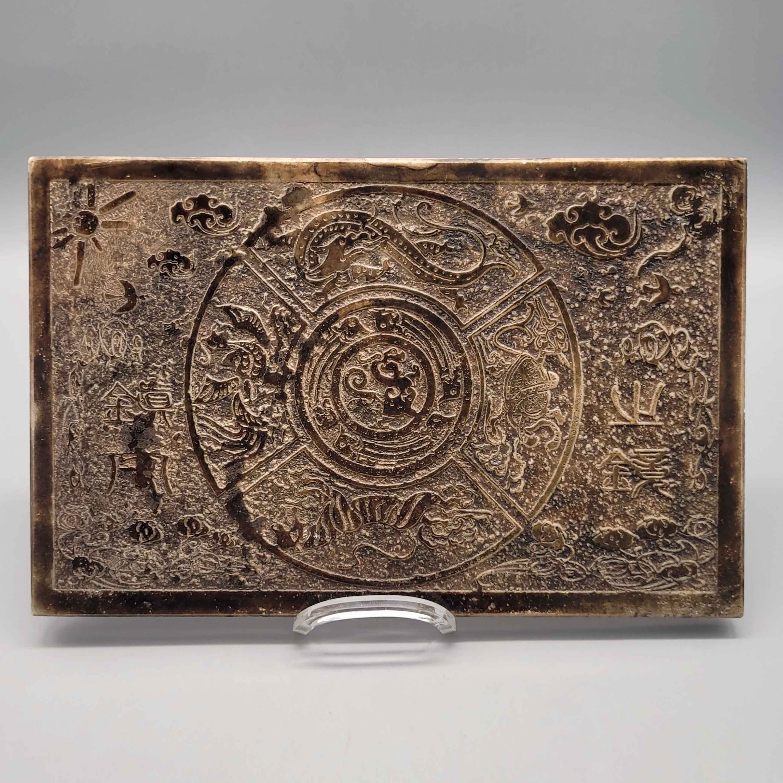 AndachtstafelJade, doppelseitige Reliefdarstellung „Rad des Lebens“, Inschriften, China, wohl um 1900, 16 x 24,5 cm