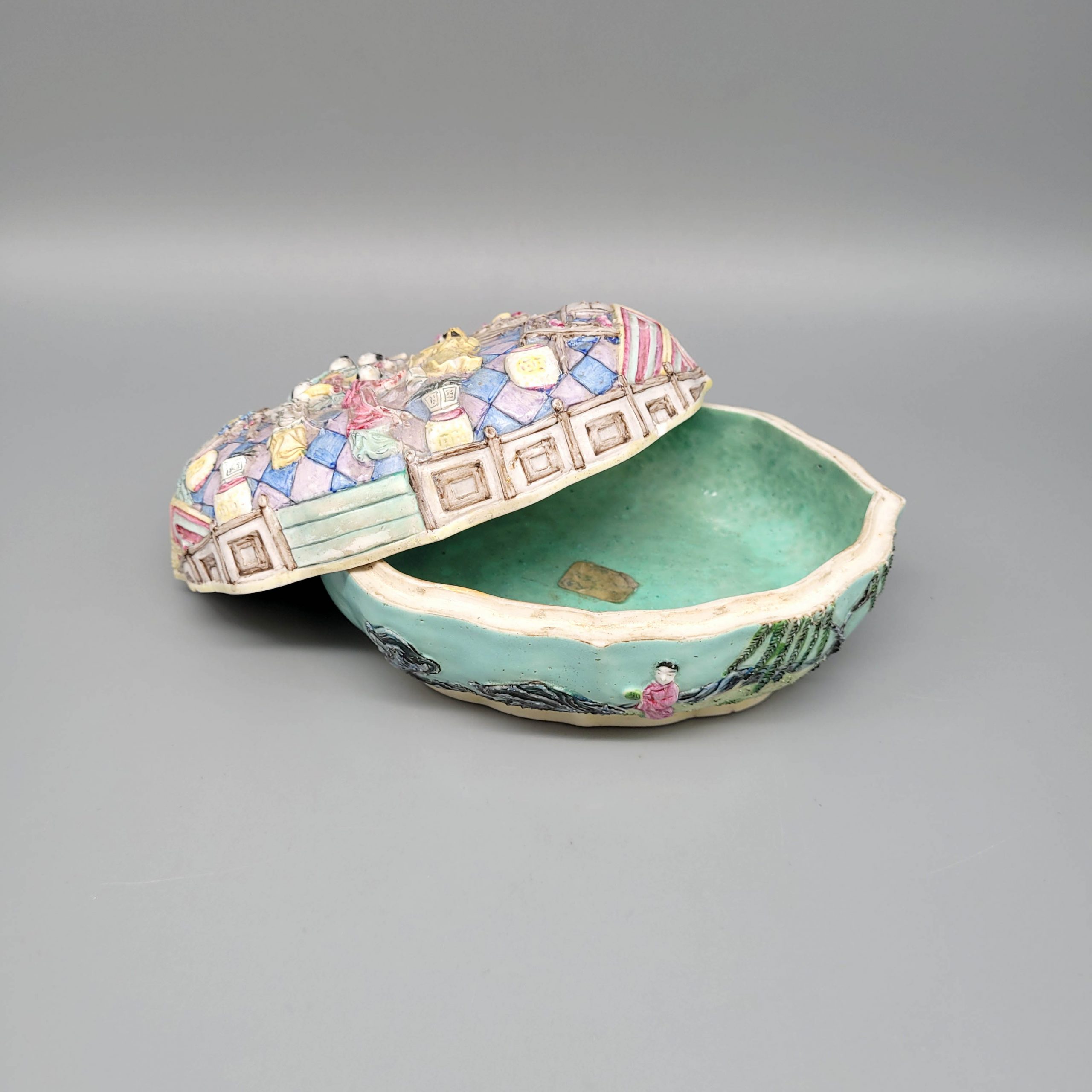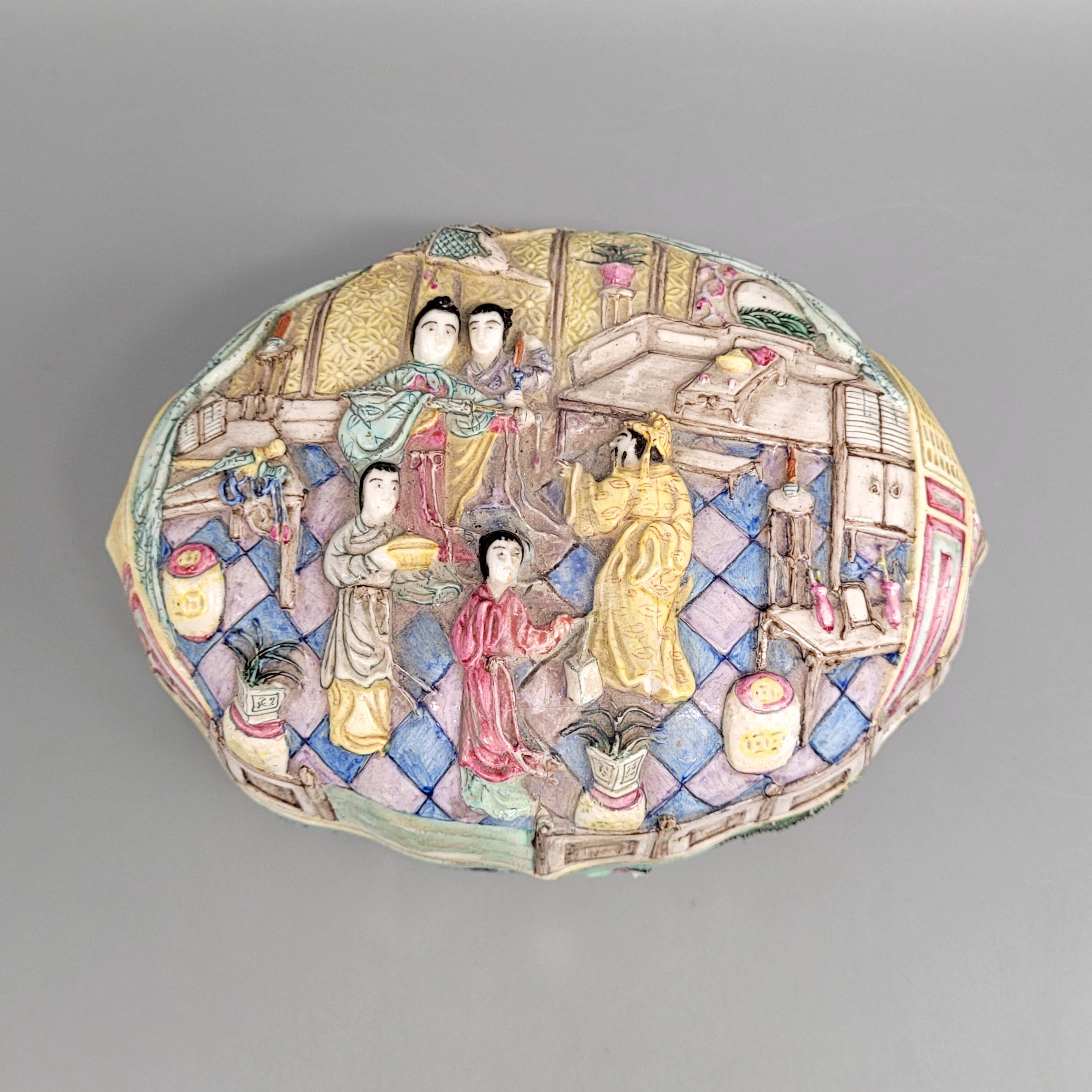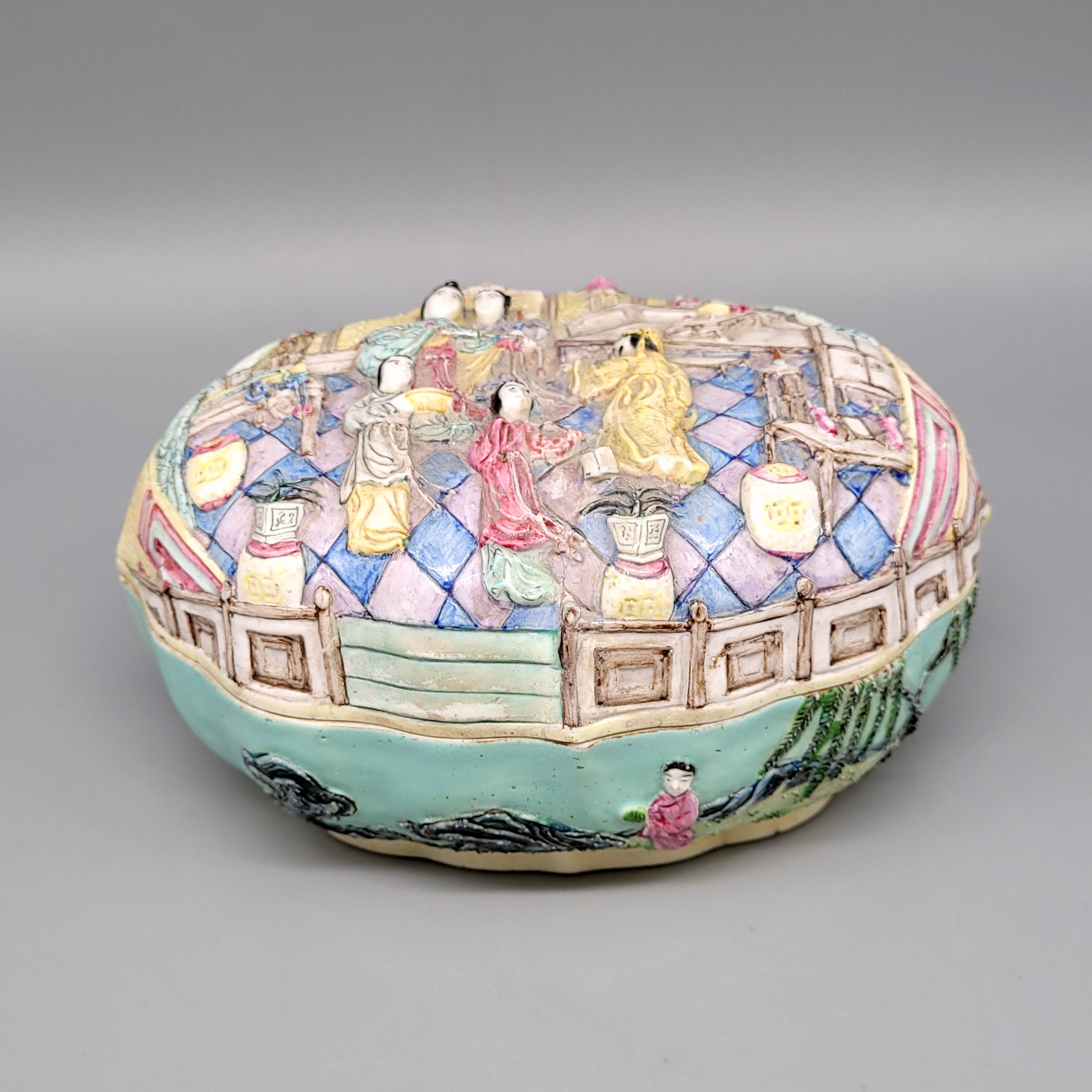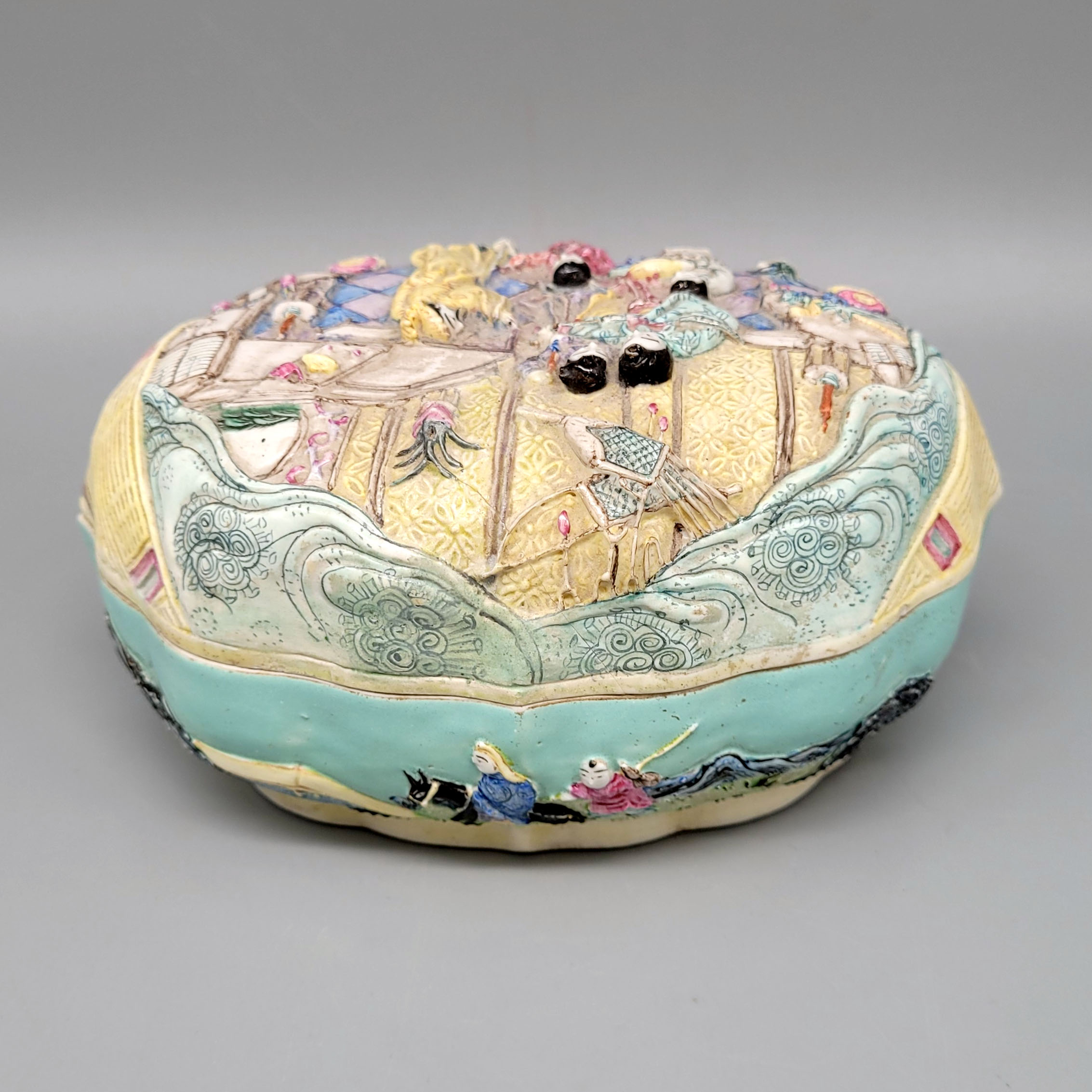 DeckeldosePorzellan, Deckel und Wandung mit figürlichem Reliefdekor, polychrom bemalt, bodenseitig gemarkt, Aufkleber „Holzapfel Collection“, China Ende 19. Jahrhundert, 8 x 14 x 10 cm