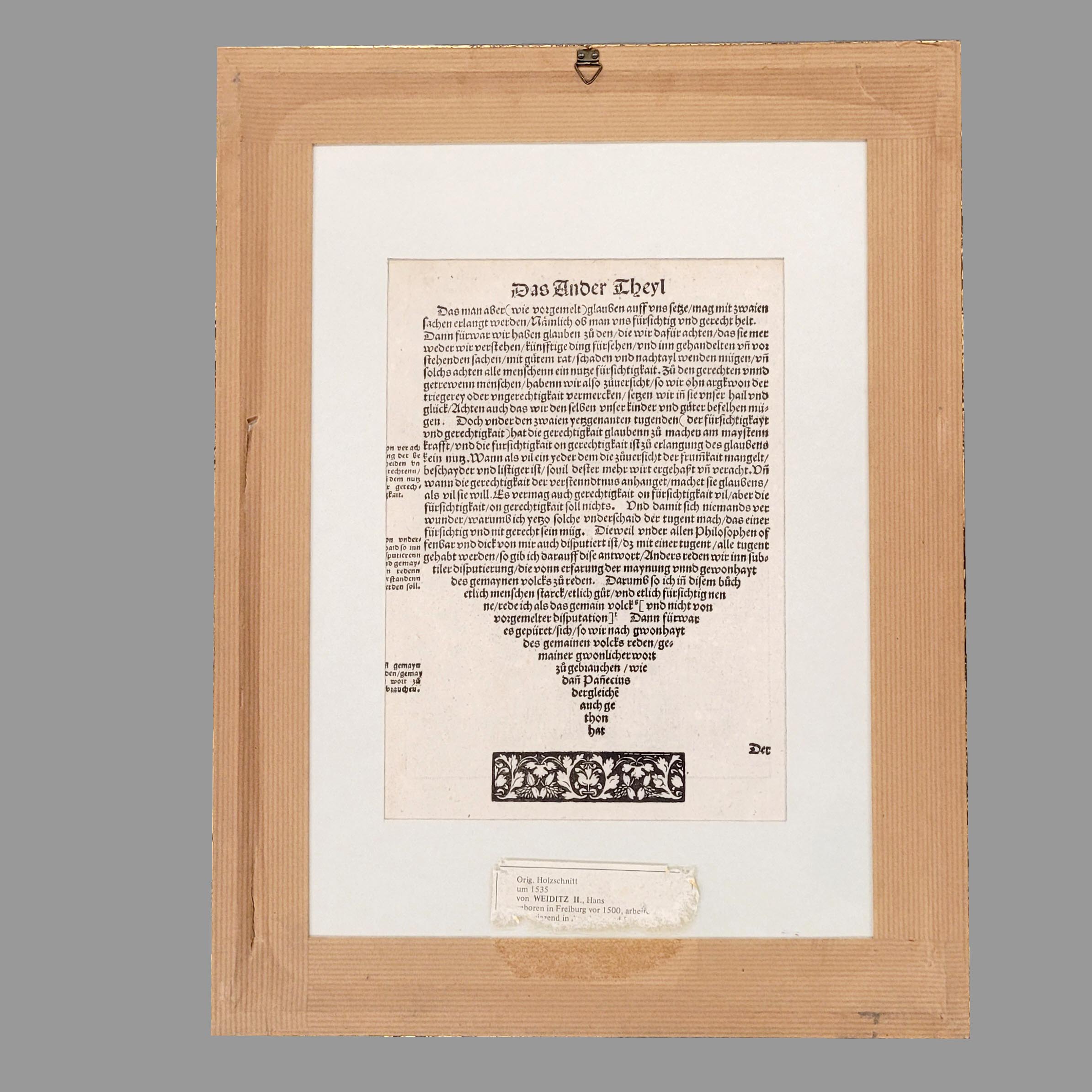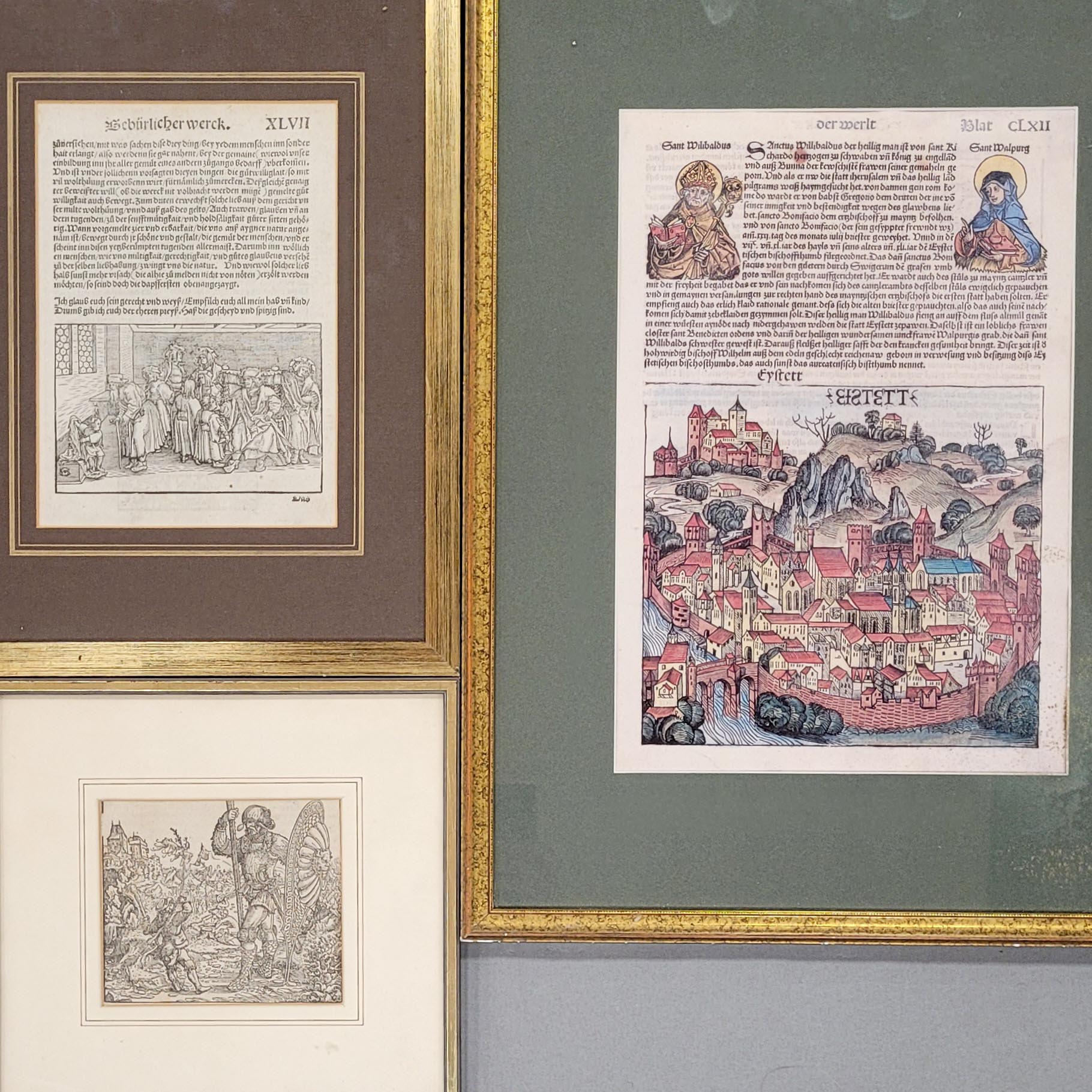 Holzschnitte, koloriert (1x), Ansicht von Eichstätt, Schedel, Liber chronicarum, Nürnberg 1493 Petrarca-Meister, Patrizier im Kreise seiner Familie, aus dem Trostspiegel, um 1540, Amman, Jost (1539-1591) David im Kampf gegen Goliath, bis zu 37,5 x 25,5 cm, alle gerahmt unter Glas und Passepartout