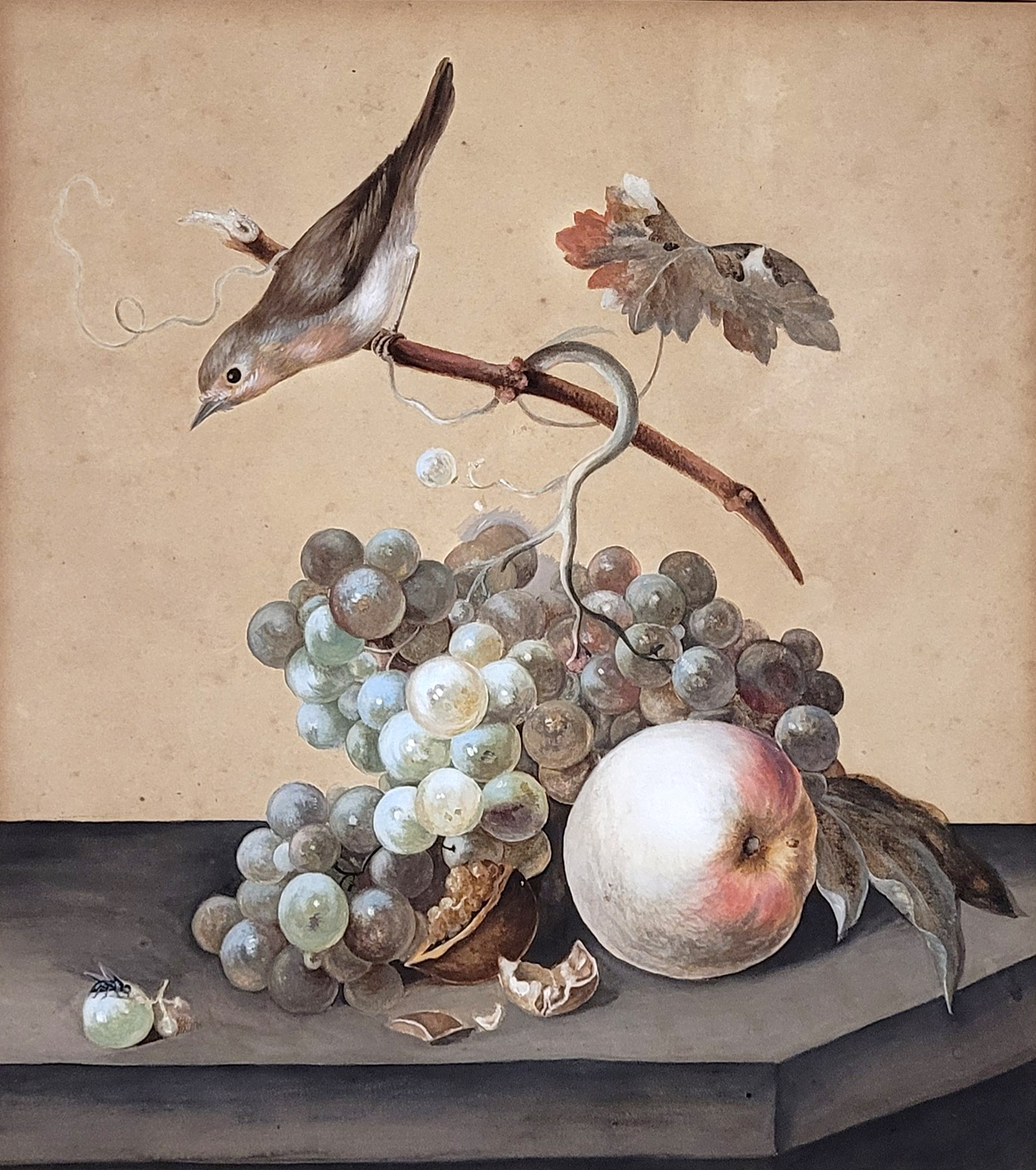 DEUTSCHER MEISTER (um 1800): Früchtestilleben mit Nachtigall und Fliege