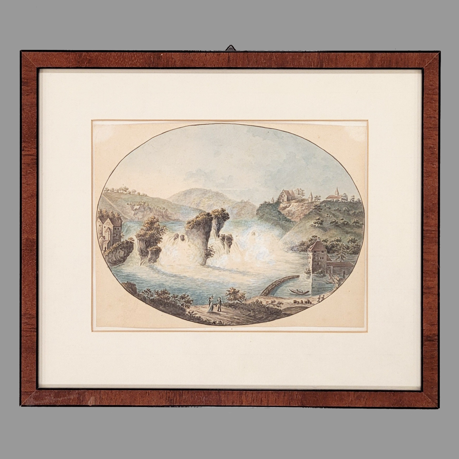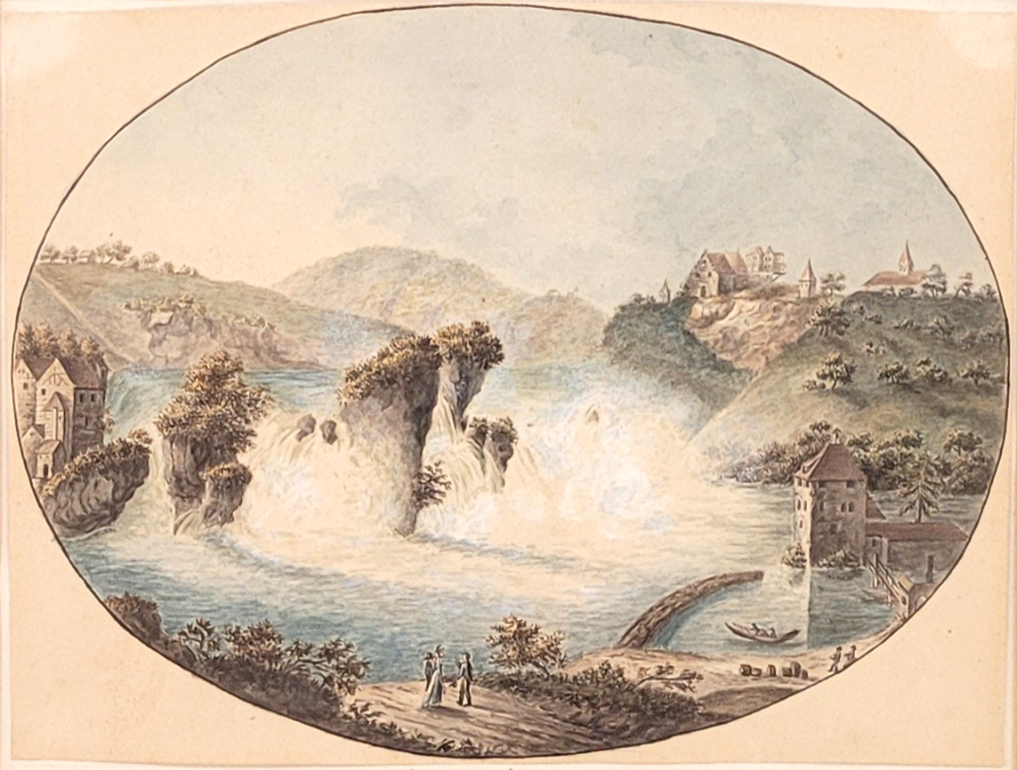 SCHWEIZER MEISTER (19. Jh.): Der Rheinfall bei SchaffhausenAquarell auf Papier, 16 x 21,5 cm (oval), gerahmt unter Glas und Passepartout