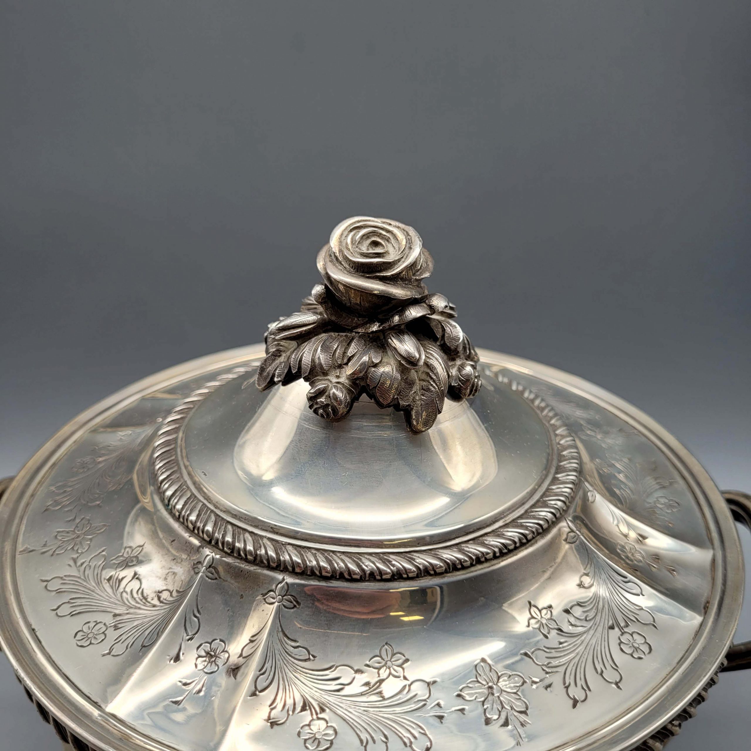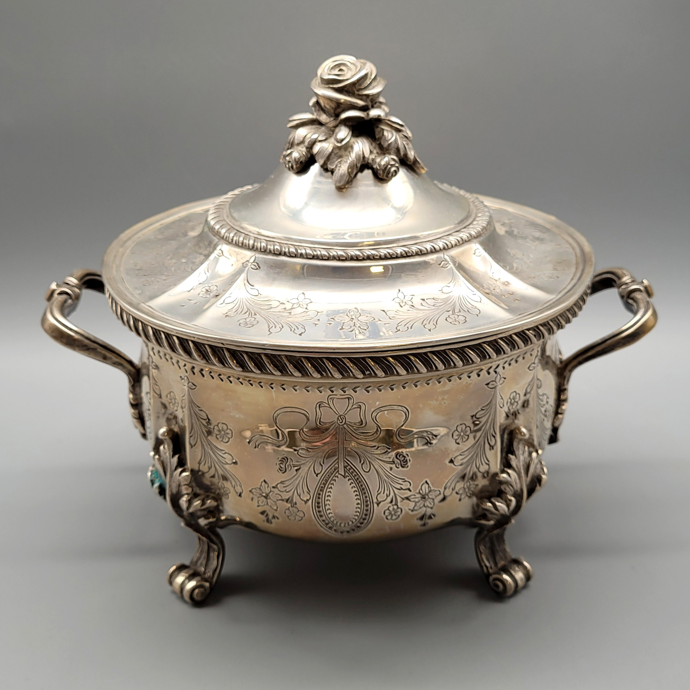 Deckelschüssel auf vier Füßen925er Silber, reich mit Blumenranken ziselierte Wandung und Deckel, Deckelknauf in Form eines Rosen-Bouquets, Portugal 20. Jahrhundert, Höhe 18 cm, Durchmesser (ohne Henkel) 17,5 cm, Gewicht 1325g