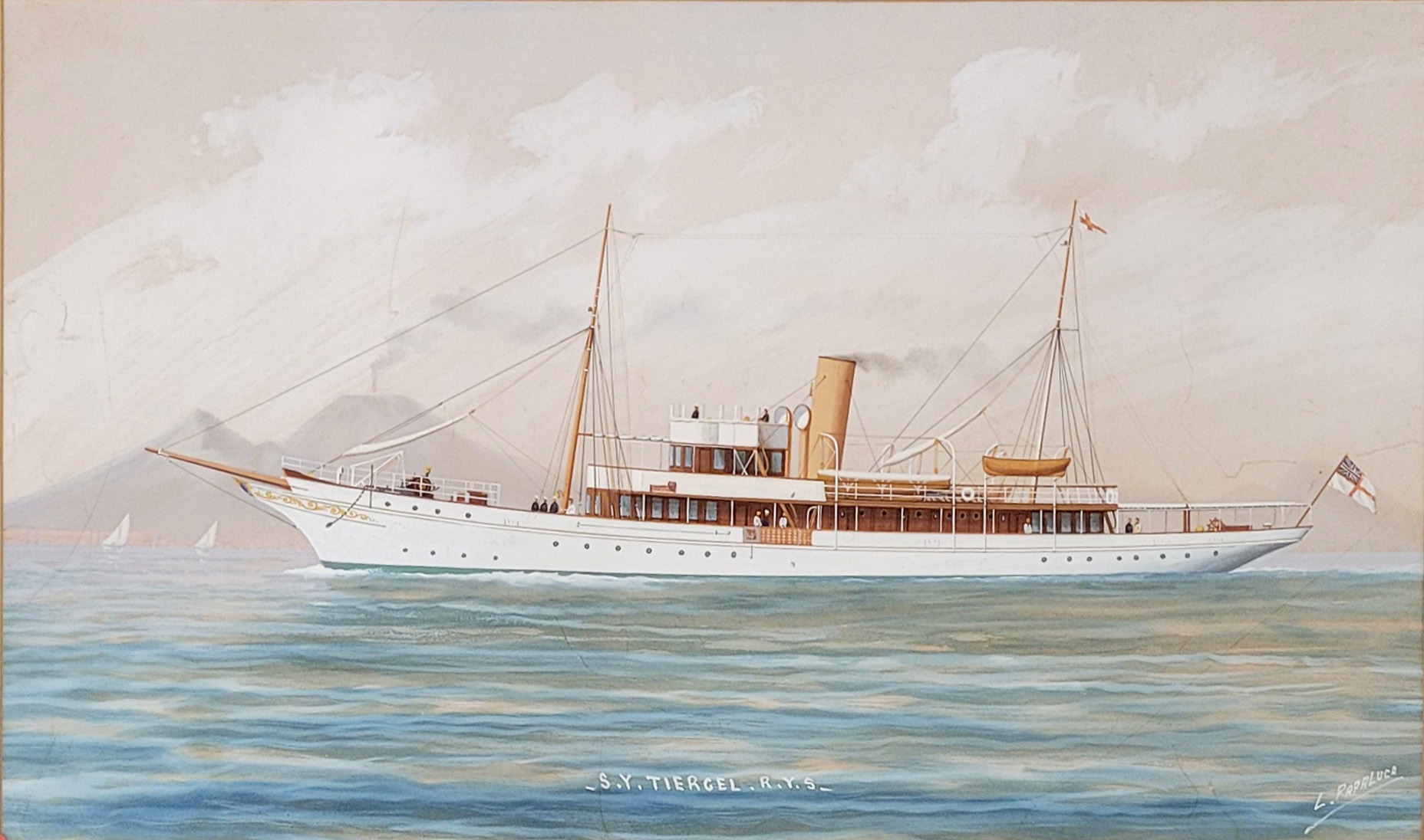 PAPALUCA, Luca (1890-1934): Die Yacht Tiergel in den Gewässern vor dem VesuvGouache auf Papier, signiert unten rechts, bezeichnet unten Mitte, 39 x 68 cm, gerahmt unter Glas und Passepartout