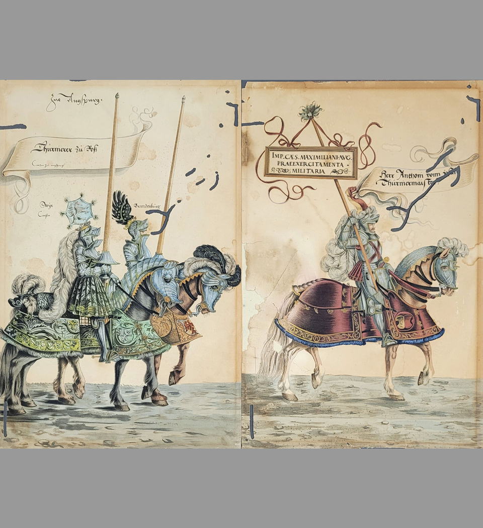 Ungefähr 1400 Jahre später regierte als Kaiser des Heiligen Römischen Reiches, Maximilian I. (1508-1519). Dieser bedeutende Habsburger Herrscher, der gern als „letzter“ Ritter bezeichnet wurde, hatte tatsächlich eine Vorliebe für mittelalterliche Ritterspiele und deren Prunk. So ließ er noch zu Lebzeiten ein umfangreiches Turnierbuch herausgeben, dass von Albrecht Dürer, Hans Burgkmair d. Ä. und anderen Künstlern mit Holzschnitten versehen wurde. Ein weiteres auf den Triumphzug Kaiser Maximilians I. (von 1518) aufbauendes Turnierbuch schuf Hans Burgkmair d. Ä. (1472-1531), dessen Original verloren gegangen ist. Kopien in Form von aquarellierten Federzeichnungen liegen aus der Hand seines Sohnes Hans Burgkmair d.J. (ca. 1500-1562) für die Jahre 1529 und 1540 vor. Aus einer weiteren Kopie, die wohl auch noch im 16. Jahrhundert entstanden ist, bieten wir vier großformatige Einzelblätter dieses Turnierbuchs an, die ebenfalls als aquarellierte Federzeichnungen auf Papier ausgeführt wurden.