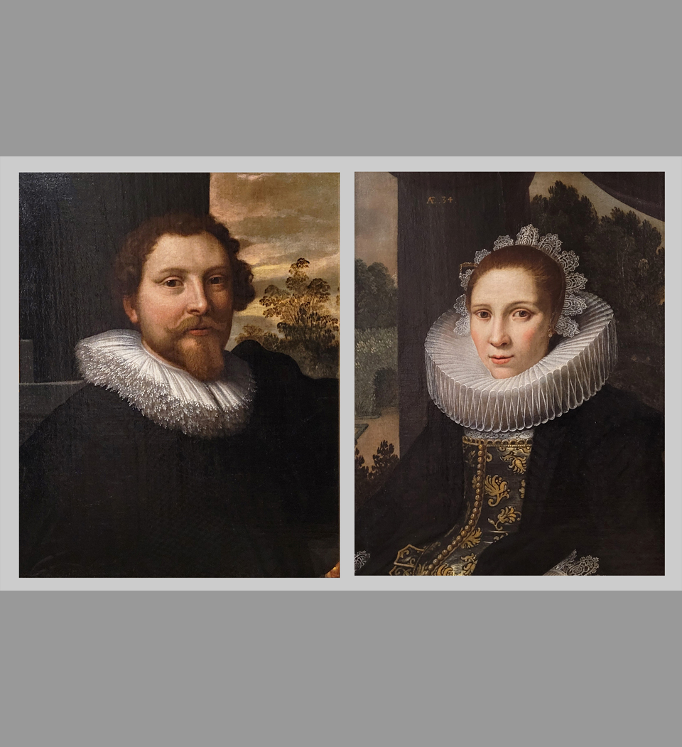 Zum Abschluss soll noch auf die eindrucksvollen Porträts eines Mannes und einer Frau verwiesen sein, die ein Künstler aus dem Umkreis des Cornelis de Vos (1584-1651) um 1620 geschaffen hat. Auch wenn uns der Künstler nicht bekannt ist, sind die beiden Bilder eindrucksvolle Zeugen der goldenen Zeit Antwerpens. Reichtum und Zufriedenheit der Porträtierten kommen bis heute hier eindrucksvoll zur Geltung.